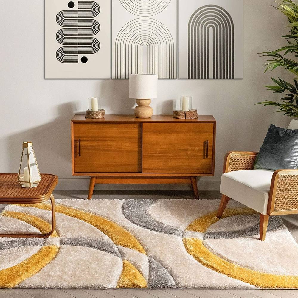 This handmade multicolor polyester rug brings a refreshing blend of warmth and style to your interiors. Featuring curved yellow and grey patterns on a soft ivory base, it adds a touch of modern sophistication and comfort. Packed & quality-checked by Indianshelf.
