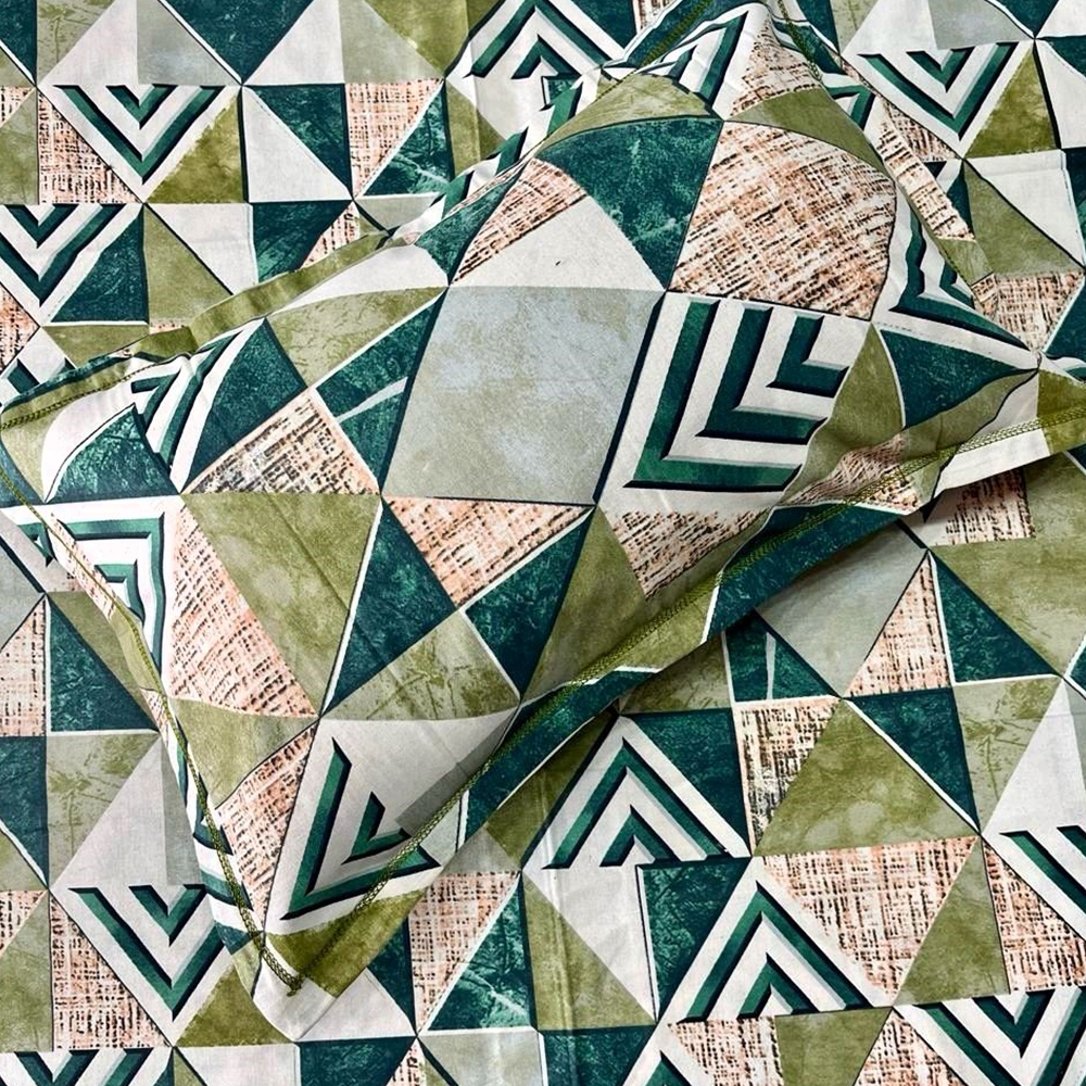 Add a bold and modern flair to your bedroom with this Geometric Print King Size Bedsheet Set. Featuring sharp triangular and textured block patterns in shades of green, beige, and teal, this bedsheet set strikes the perfect balance between contemporary design and cozy comfort. Made from 100% pure cotton casement fabric, it ensures breathable softness and long-lasting durability.This 3-piece set includes one flat (non-fitted) king-size bedsheet and two matching pillow covers, designed to elevate your room’s aesthetics with sharp lines and clean symmetry. Ideal for modern homes and stylish gifting.