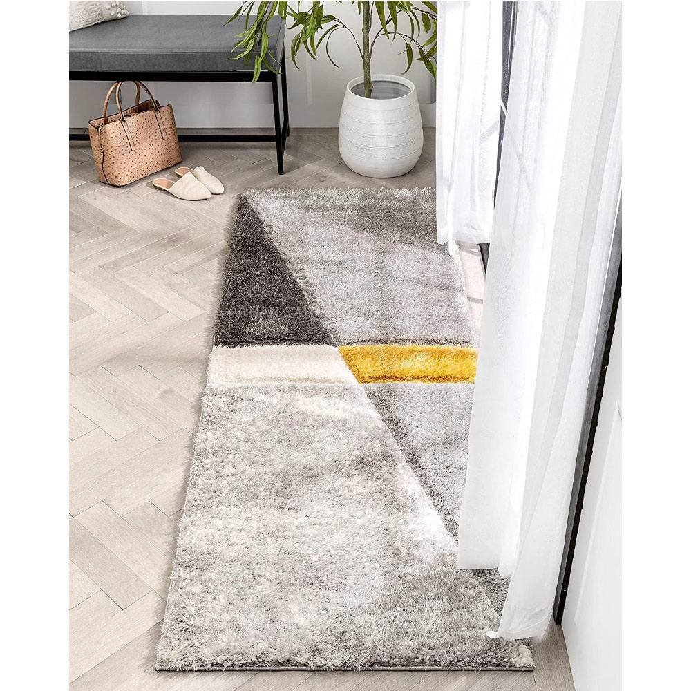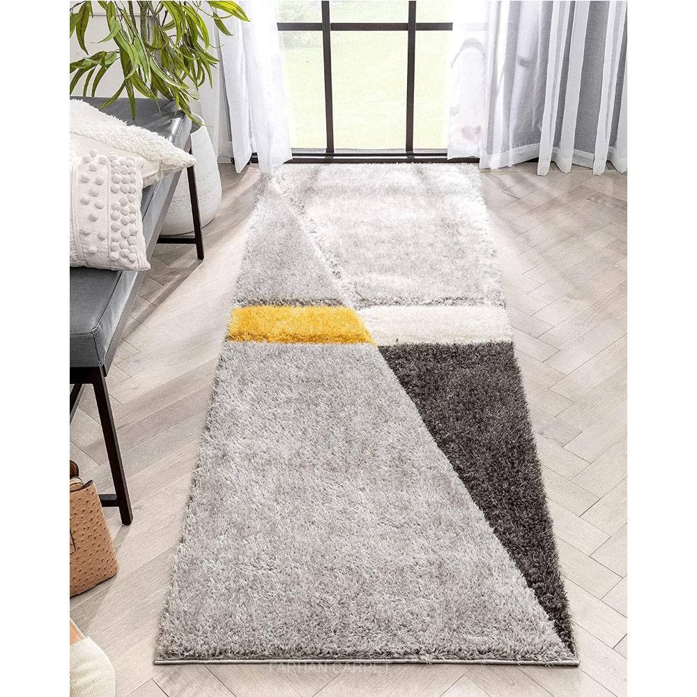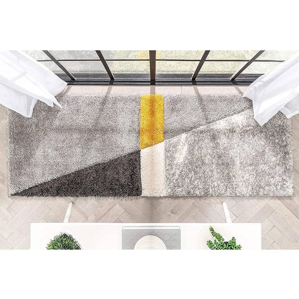 This handmade multicolor polyester rug features a contemporary geometric design in shades of grey, ivory, black, and mustard yellow. Its subtle yet vibrant pattern makes it a perfect choice for hallways, living areas, and modern interiors. Packed & quality-checked by Indianshelf.