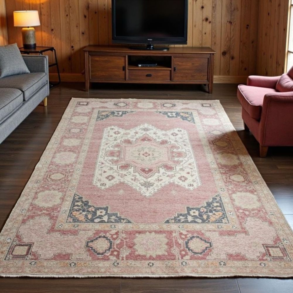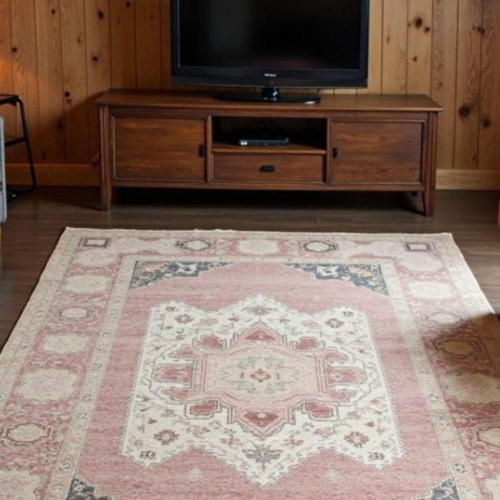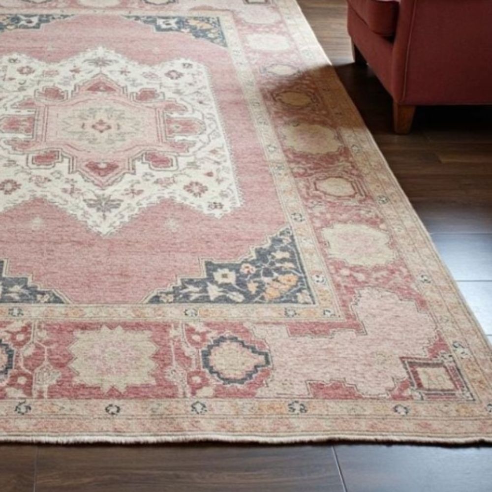 Add warmth, elegance, and a touch of antique charm to your space with this Vintage-Inspired Hand-Knotted Wool Rug, carefully handcrafted by master artisans in Bhadohi, India. With its soft blush pink field, intricate ivory medallion, and subtly distressed finish, this rug evokes the feeling of a timeworn heirloom while offering modern-day durability. Product Specifications: Available Sizes: 4x6 ft 5x8 ft 6x9 ft 8x10 ft 9x12 ft Custom sizes available on request Design: Central medallion with floral and geometric Oushak-style motifs Color Palette: Blush/Faded Pink field Antique Ivory center medallion Faded Charcoal Blue and Golden Beige accents Material: 100% premium hand-spun wool Technique: Fully hand-knotted by experienced artisans Pile: Medium-low pile soft underfoot and easy to maintain Processing Time: 45 weeks (made to order) Made In: Bhadohi, India World-renowned for fine handmade rugs Crafted with Heritage & Heart: Woven knot by knot by skilled weavers in Bhadohi, this rug represents the finest in Indian artisan tradition. The faded tones and intricate borders are designed to mimic the worn beauty of antique Turkish and Persian rugs, making it perfect for vintage, boho,.