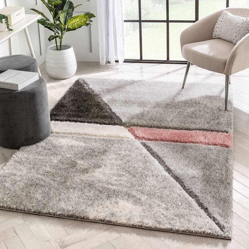 - Features a geometric pattern with blush and grey accents