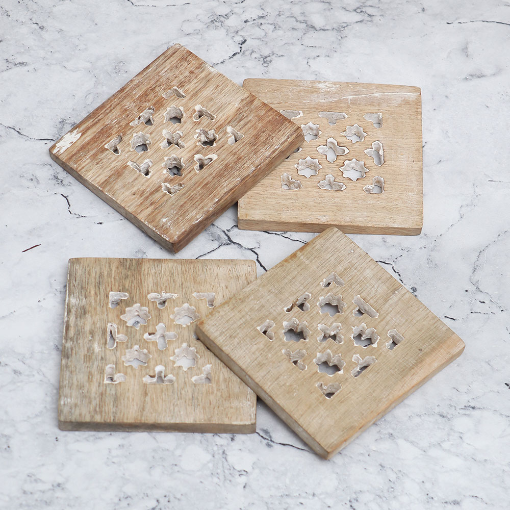Buy a beautiful Pack of 4 wooden coasters online that is a true epitome of elegance and craftsmanship. Handcrafted by highly skilled Indian artisans, these square-shaped coasters are crafted with the utmost care and precision using high-quality wood. Each coaster features intricate jali engraving, adding a touch of antique charm to its overall design. Finished in a rich and alluring antique brown, these wooden tea coasters not only serve their functional purpose but also double as decorative pieces for your home or office. They effortlessly elevate any space, blending seamlessly with various decor styles. Place your water, tea, juice, or coffee glasses on these coasters to protect your surfaces from unsightly stains, whether you\'re at home, the office, a restaurant, hotel, or cafe. These coaster sets make for the best wooden coasters, thanks to their superior craftsmanship and durable construction. They are also an ideal gift for your family, friends or relatives on special or festive occasions, showcasing your impeccable taste and thoughtfulness.