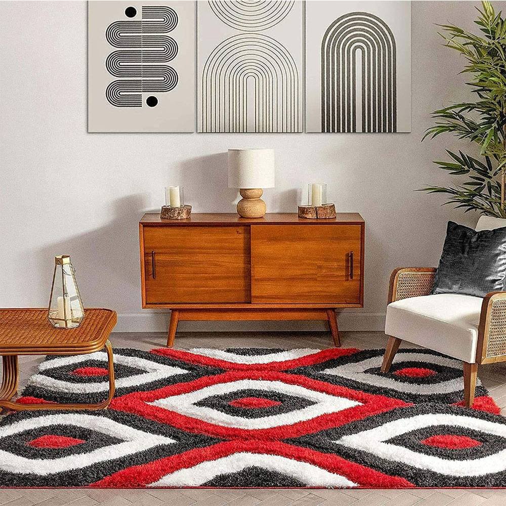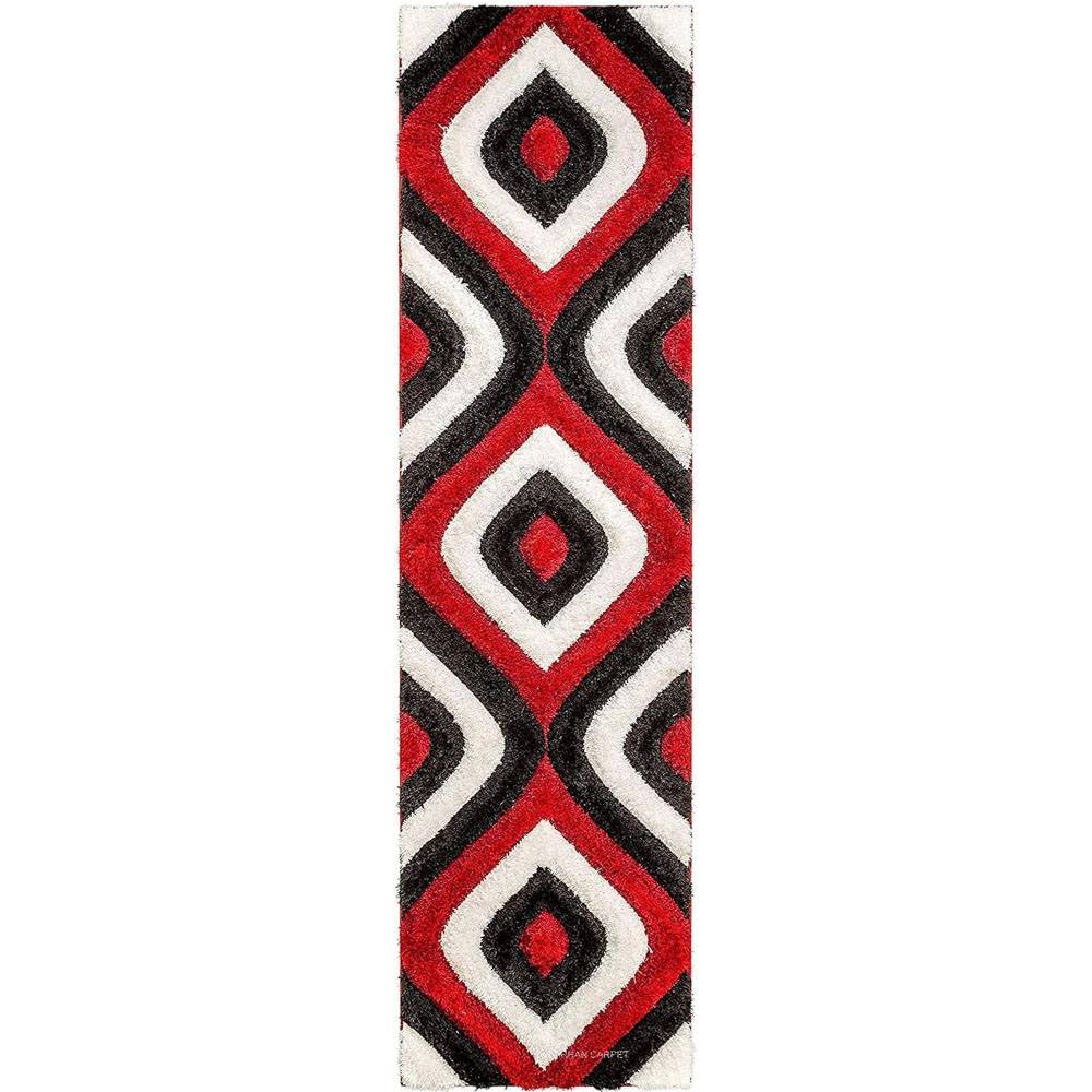 This handmade multicolor polyester rug showcases a bold geometric pattern in red, black, and white, perfect for adding drama and depth to any room. Its plush surface and modern appeal make it a standout décor piece. Packed & quality-checked by Indianshelf.