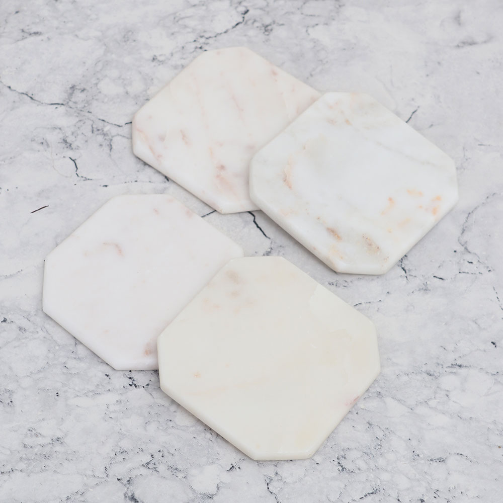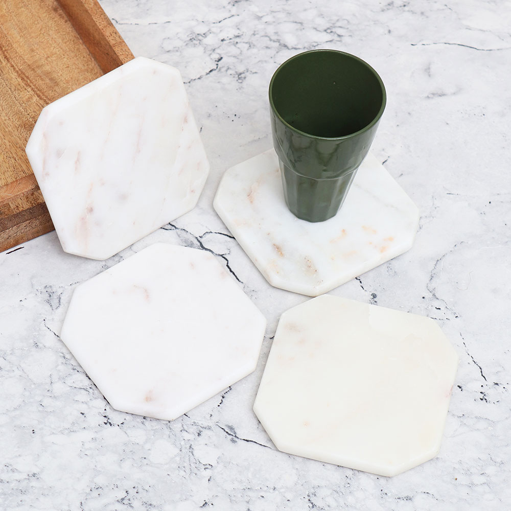 This Pack of 4 Marble Tea Coasters is crafted from premium-quality wood by highly skilled and experienced artisans from India. Each coaster features a unique square shape with beautifully curved corners, adding an elegant touch to any setting. Handcrafted with precision and care, these coasters are a testament to the artisan’s craftsmanship. Finished in a pristine white colour, these coasters effortlessly blend style and functionality, making them a perfect decorative piece for your home or office. Their purpose goes beyond aesthetics, as they are designed to hold water, tea, juice, or coffee glasses, ensuring your surfaces remain free from stains and spills. These Marble coaster sets are versatile, ideal for use in various environments such as homes, offices, restaurants, hotels, or cafes. They not only protect your surfaces but also elevate the visual appeal of your space. Furthermore, they make for an exceptional gift option for your family, friends or relatives on special or festive occasions.