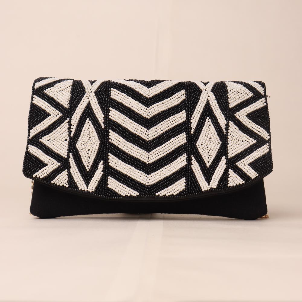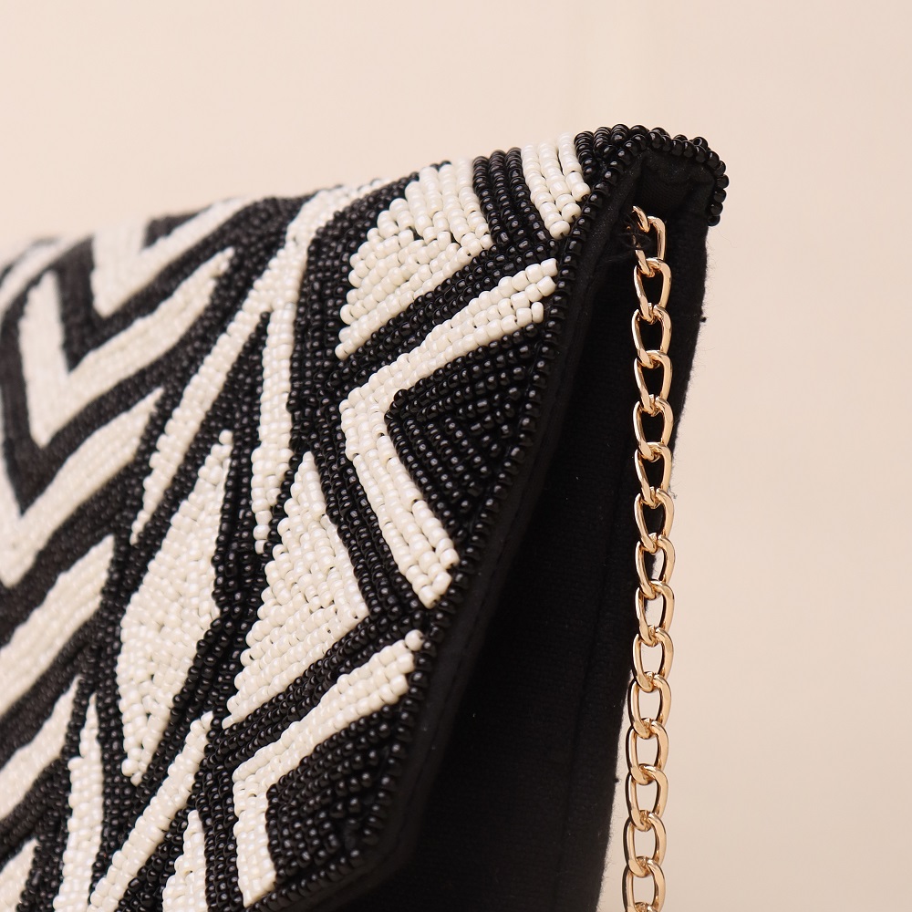 Elevate your accessory game with this bold and sophisticated hand-beaded sling bag, featuring a striking black-and-white geometric pattern. The meticulous beadwork creates a textured, eye-catching design perfect for both formal and casual occasions. Complete with a detachable gold-tone chain strap, this versatile piece can be worn as a crossbody, shoulder bag, or carried as an elegant clutch. An ideal statement accessory for modern minimalists and style enthusiasts alike.