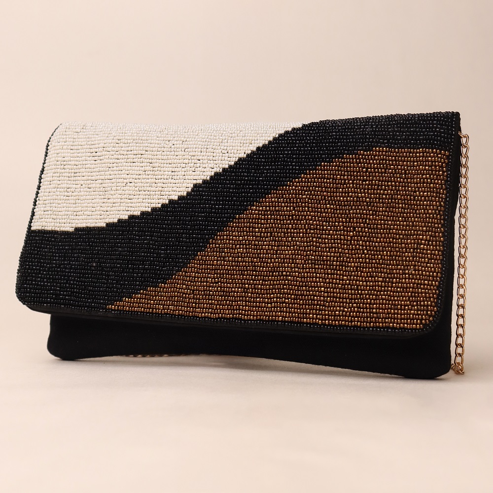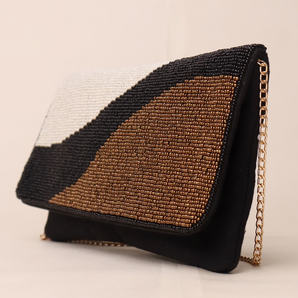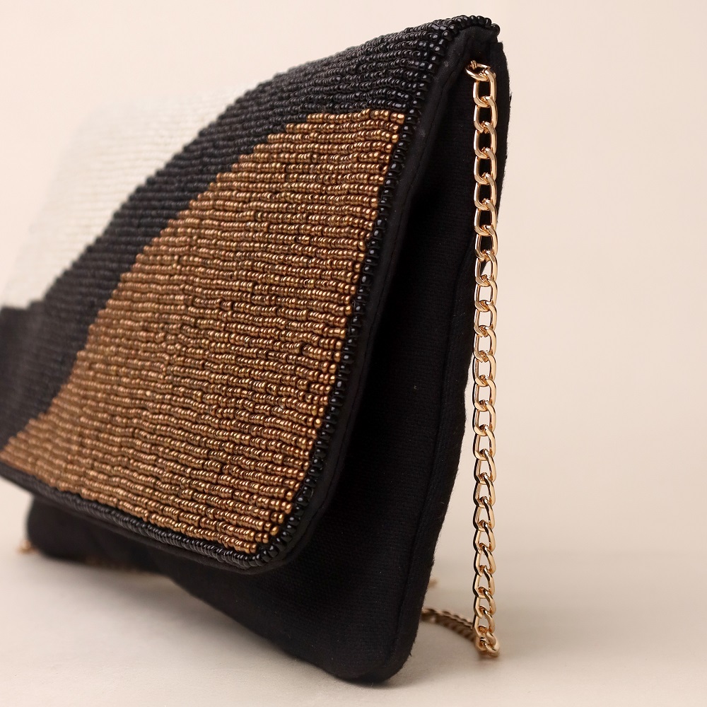 Sophisticated and contemporary, this hand-beaded sling bag showcases an artistic wave design in classic black, ivory, and bronze tones. Crafted with meticulous bead embroidery, it offers a refined balance of minimalism and statement style. The sleek envelope flap pairs beautifully with the gold-tone chain strap, giving you the option to wear it as a crossbody or carry it as a clutch for elegant evenings. Perfect for formal gatherings, cocktail nights, or adding a touch of modern glamour to your look.