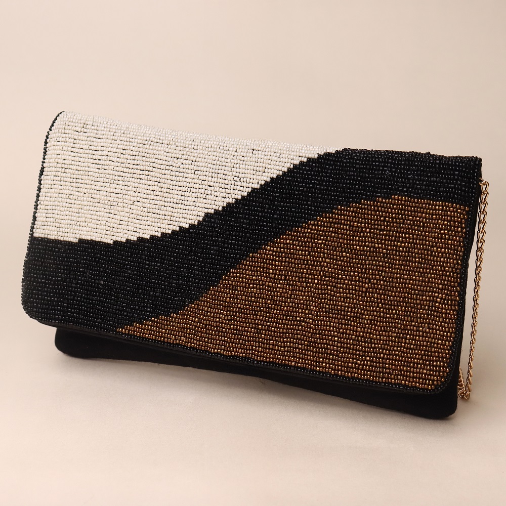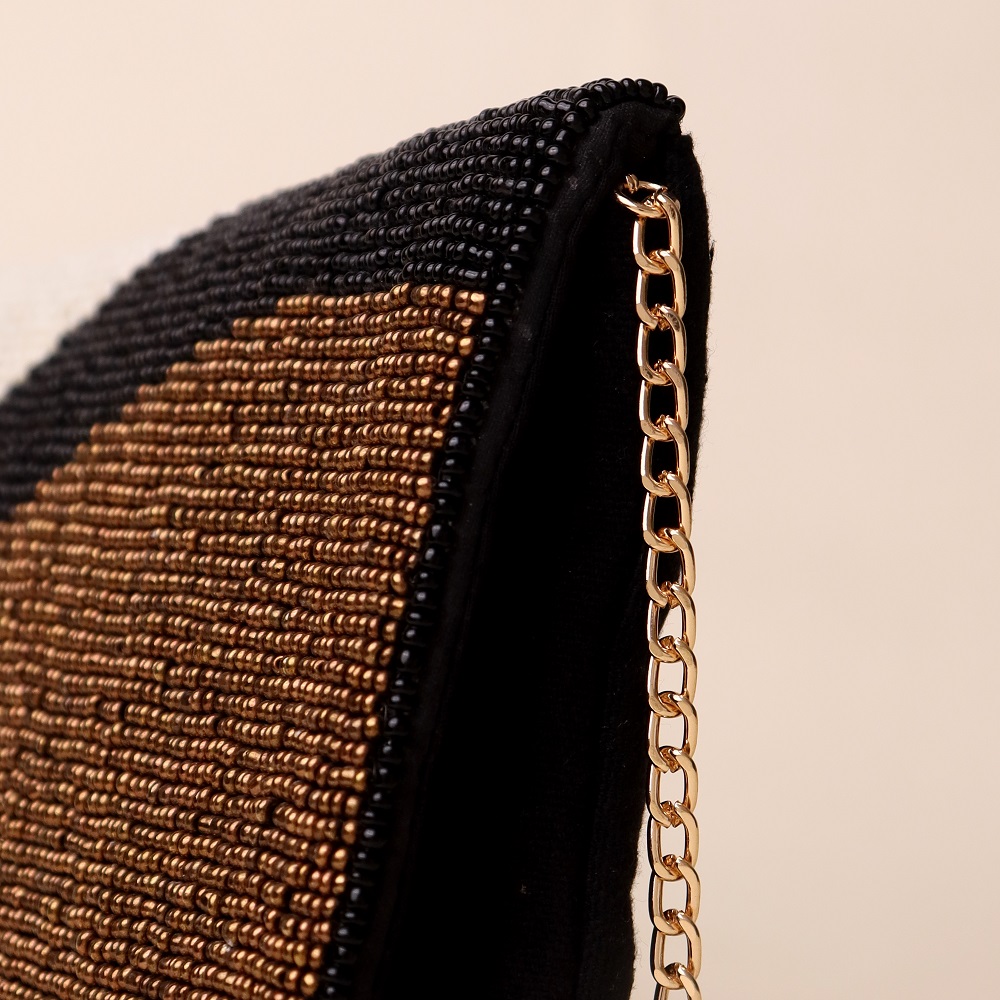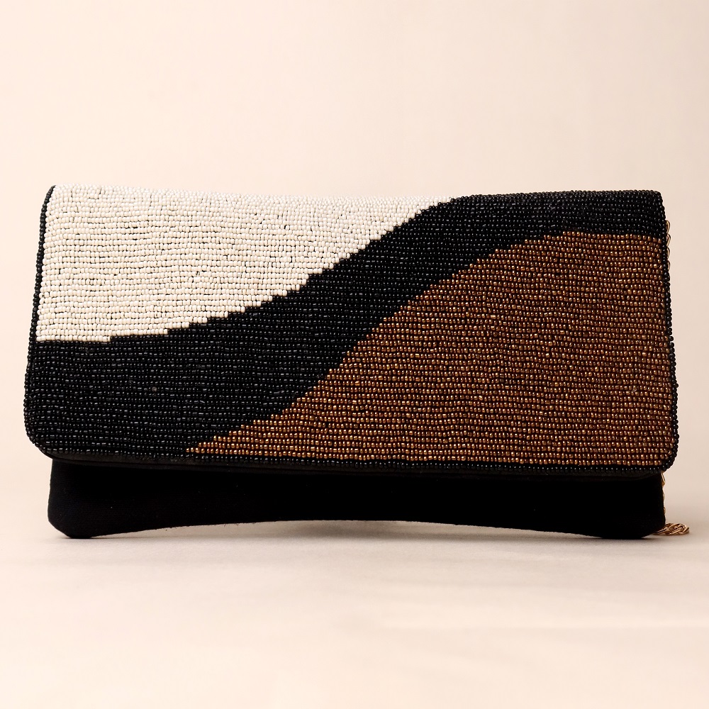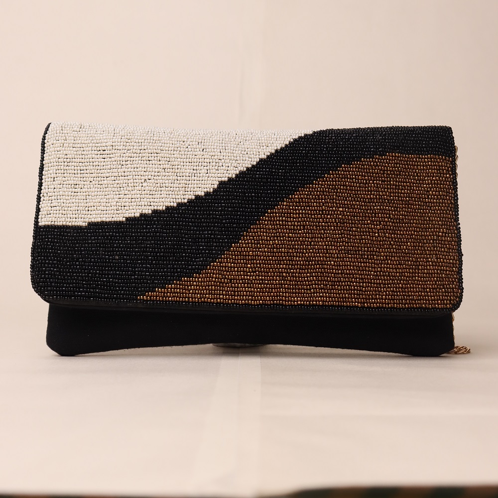 Sophisticated and contemporary, this hand-beaded sling bag showcases an artistic wave design in classic black, ivory, and bronze tones. Crafted with meticulous bead embroidery, it offers a refined balance of minimalism and statement style. The sleek envelope flap pairs beautifully with the gold-tone chain strap, giving you the option to wear it as a crossbody or carry it as a clutch for elegant evenings. Perfect for formal gatherings, cocktail nights, or adding a touch of modern glamour to your look.