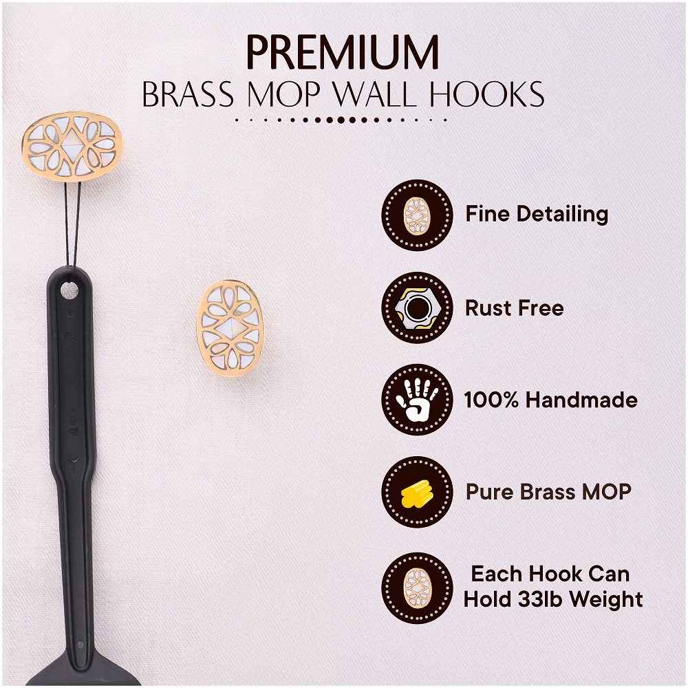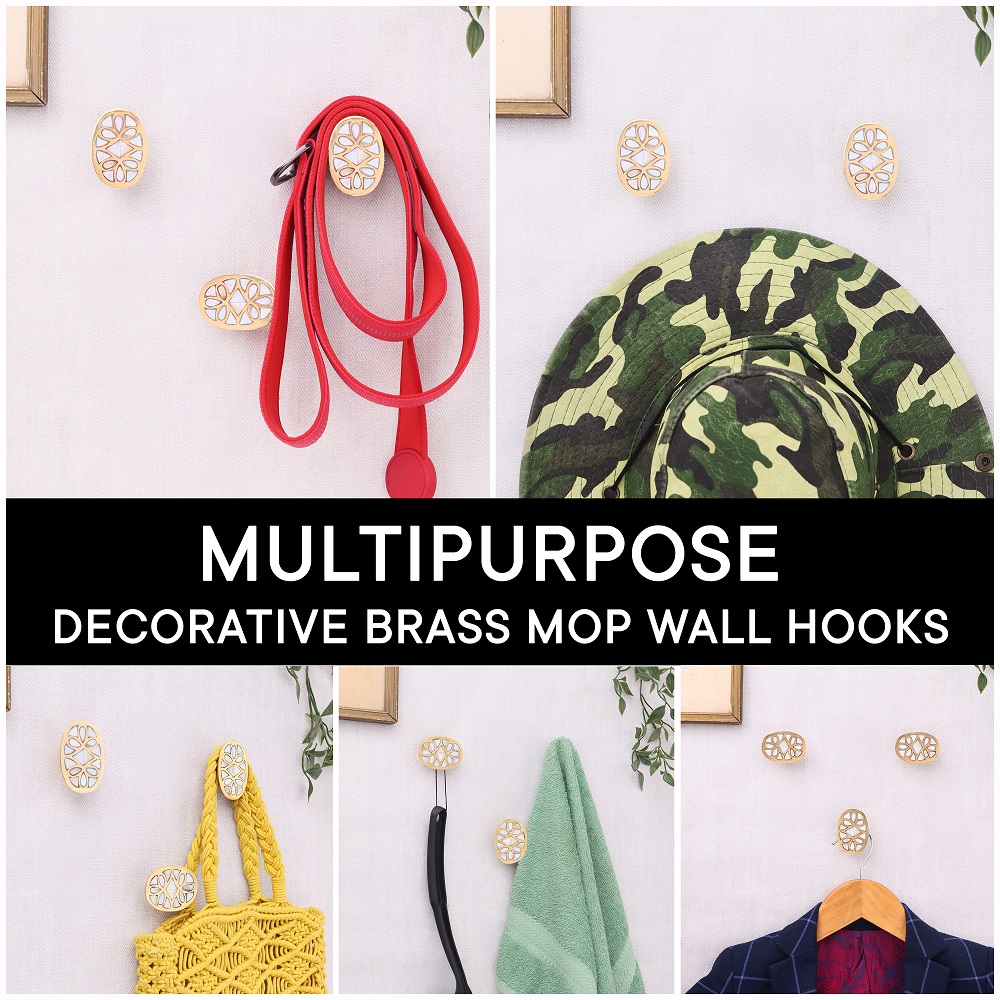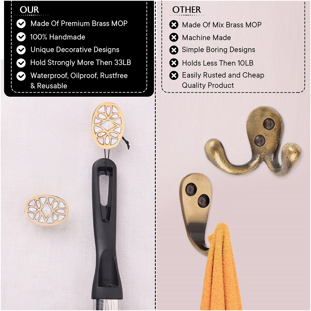 Handmade Mother of Pearl Golden White Finish Wall Hooks Set of 3 is perfect for hanging towels, clothes, hats, bags, keys, scarves and jackets. It's very easy to mount on a wall or door.