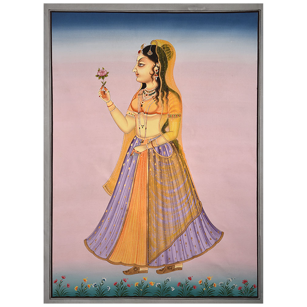 This is a beautiful Mughal miniature art painting of the court woman clutching a flower. Mughal history is fascinating for reasons other than politics. Though we know the legends of Mughal kings by heart, we frequently overlook the royal Mughal women of the court. Though they were not open about it, Mughal women had an important role in regal decisions, delegations, city design and of course carrying the lineage and guiding them to be men and women of the royal dynasty.