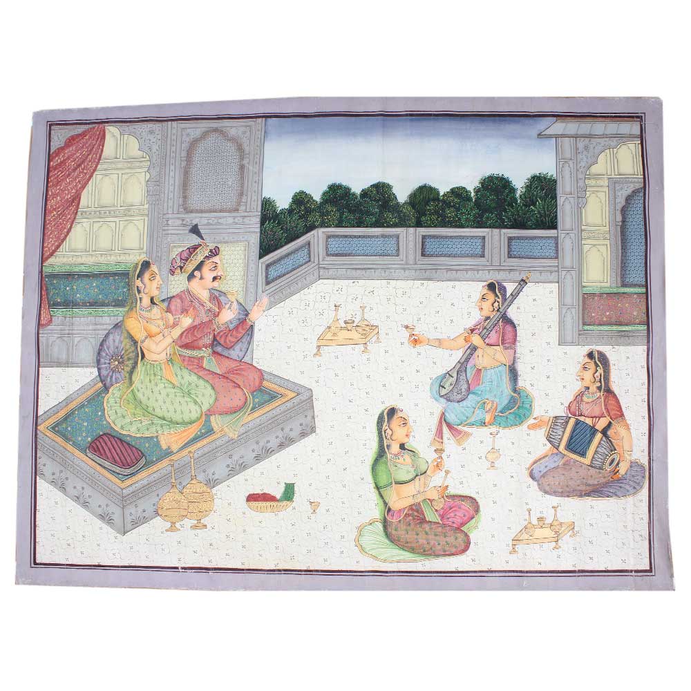 The Mughal monarch is depicted in this miniature painting relaxing with his lover and five attendants. This painting's exquisite brush work reveals its sophisticated nature, painted on old manuscript paper by an artist.