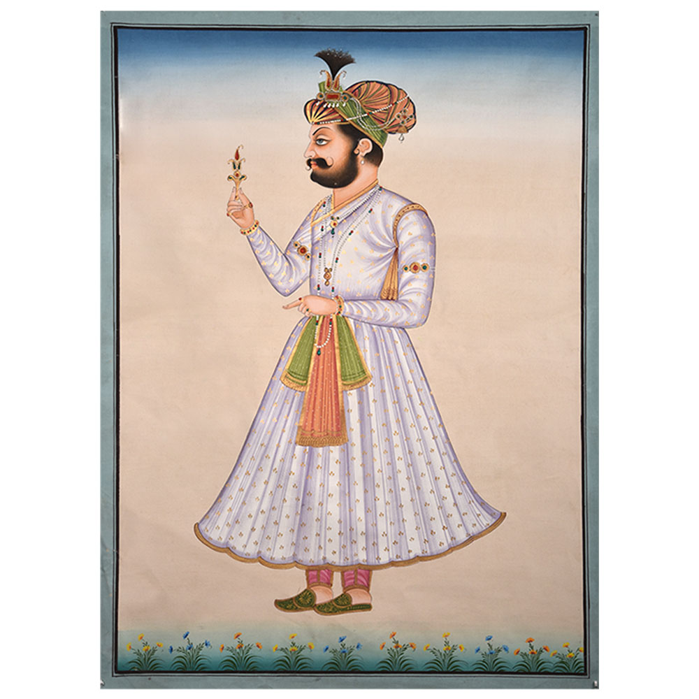 This is a lovely Mughal miniature painting of the emperor holding a flower in his hand with a blend of the Persian and Indian style. The border and dress are embellished with gold motifs and designs. Mughal miniature art collection is rare. The artist painted this lovely painting with a stone colour and a squirrel single hair brush to give it a natural, dynamic, and long-lasting appearance.