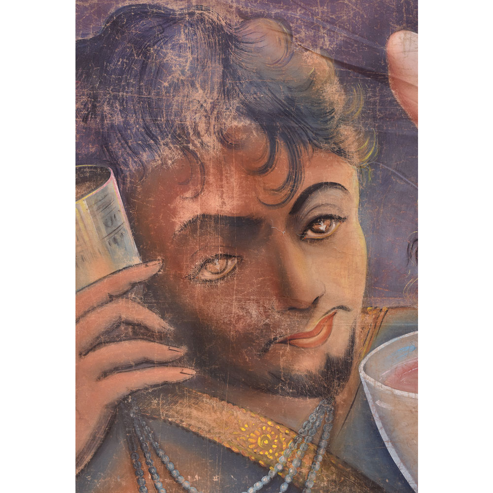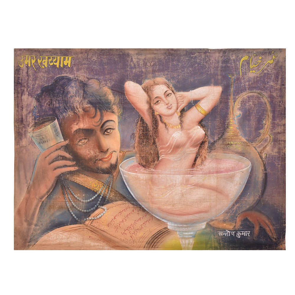 Buy a beautiful Canvas painting that is a masterpiece created by skilled Indian artists, depicting a man holding a cup near his ear and a book placed in front of him. The book has text written in Urdu language and the man seems to be intently listening to what the book has to say. In the cup beside him, a woman is seated in a pink liquid cup, adding a pop of colour to the painting. On the top left corner of the painting, the name "Umar Khayam" is inscribed in Hindi language, while on the top right corner, there is text written in Urdu. The bottom right corner of the painting displays the name of the artist "Santosh Kumar". The intricate detailing and use of multi-colours make this painting a stunning piece of art. It would make a perfect addition to any living room, adding character and depth to the space. Furthermore, it makes for an excellent gift for family, friends, or relatives on special or festive occasions, giving them a chance to admire and appreciate the art and culture of India. The canvas painting is a timeless piece that would be cherished for years to come.