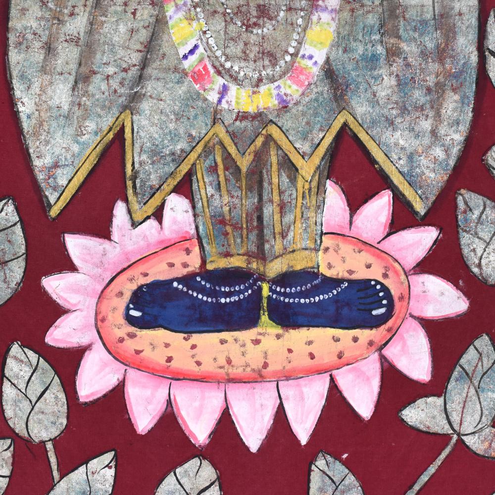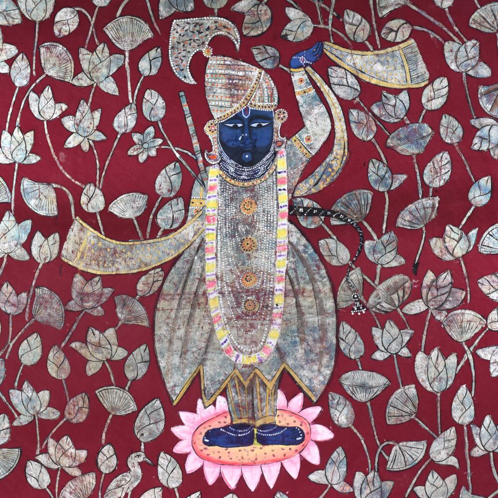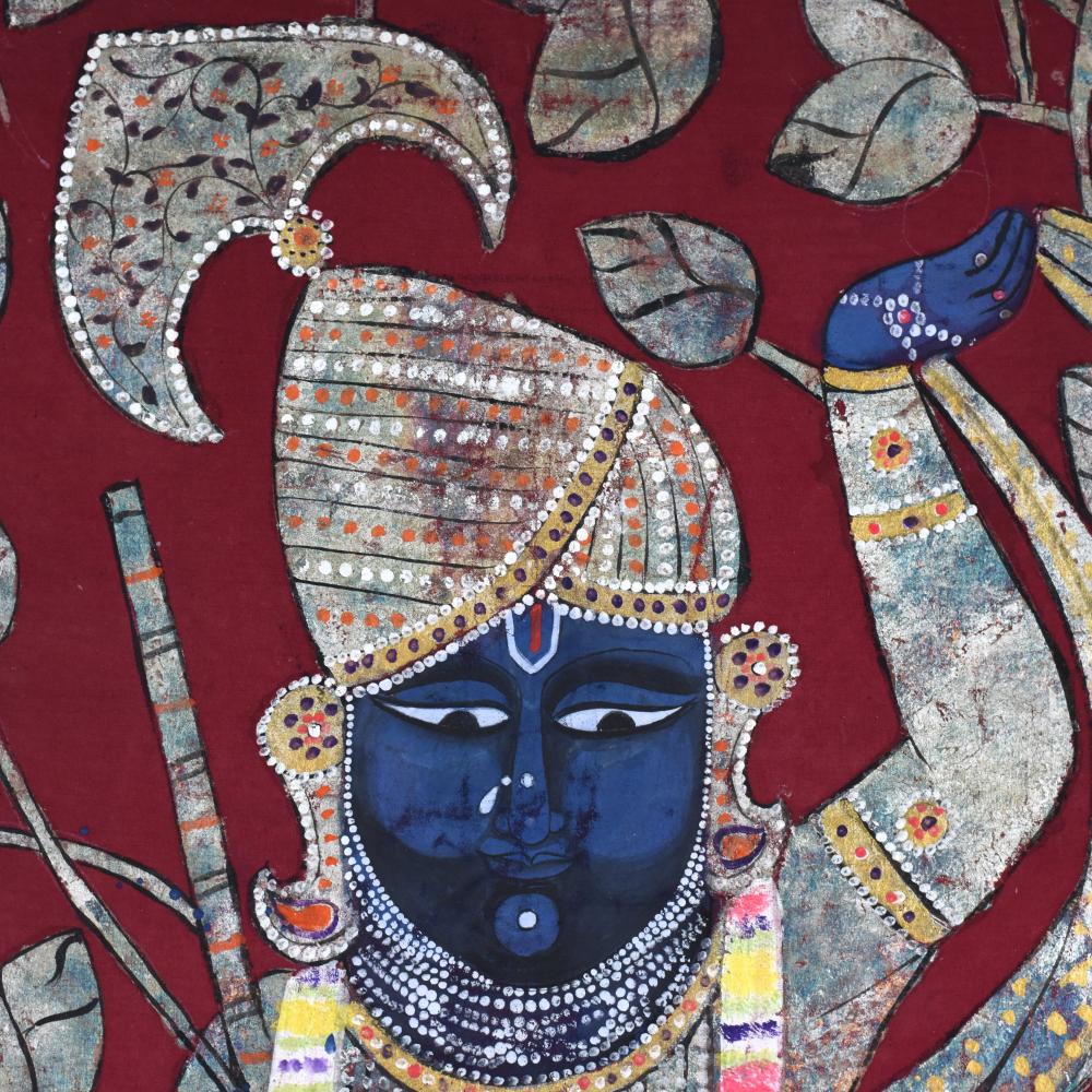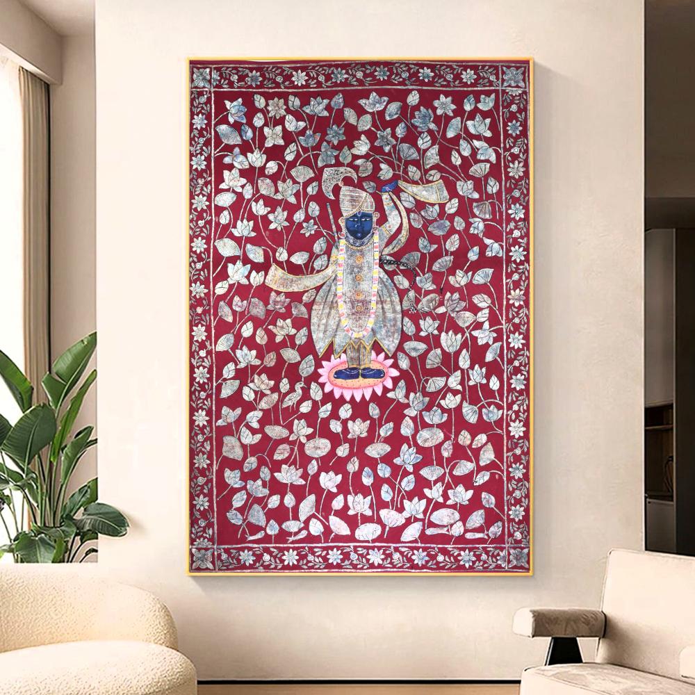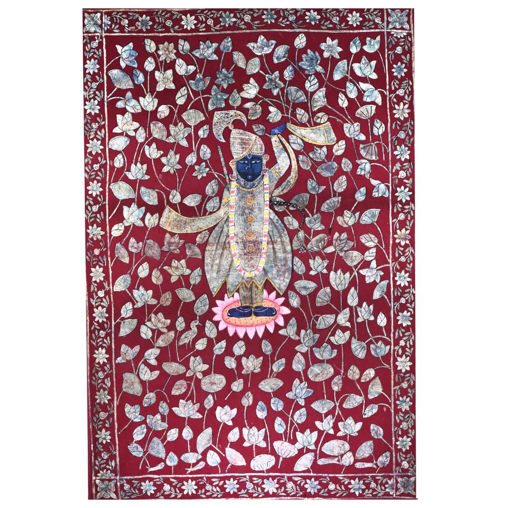 Immerse yourself in the divine beauty of Lord Krishna with this exquisite cloth pichwai painting without frame. Masterfully crafted with vibrant hues and intricate details, this work of art promises to captivate your senses and transport you to a realm of spiritual enchantment. This pichwai painting is a testament to the rich cultural heritage of India, where the art of textile painting has been perfected over centuries. As you gaze upon the serene expression and graceful pose of Lord Krishna, you'll feel a deep sense of connection to the divine, inspiring you to embark on a journey of spiritual exploration and personal growth. Whether you're a devoted Krishna devotee or simply appreciate the beauty of Indian art, this pichwai painting is a must-have addition to your home or sacred space. Elevate your living environment and nourish your soul with the captivating presence of this exquisite work of art. Immerse yourself in the timeless beauty of Lord Krishna and let this painting become a cherished centerpiece in your life.