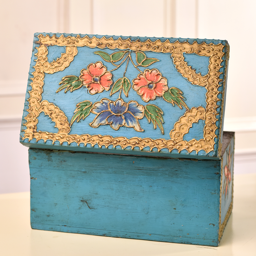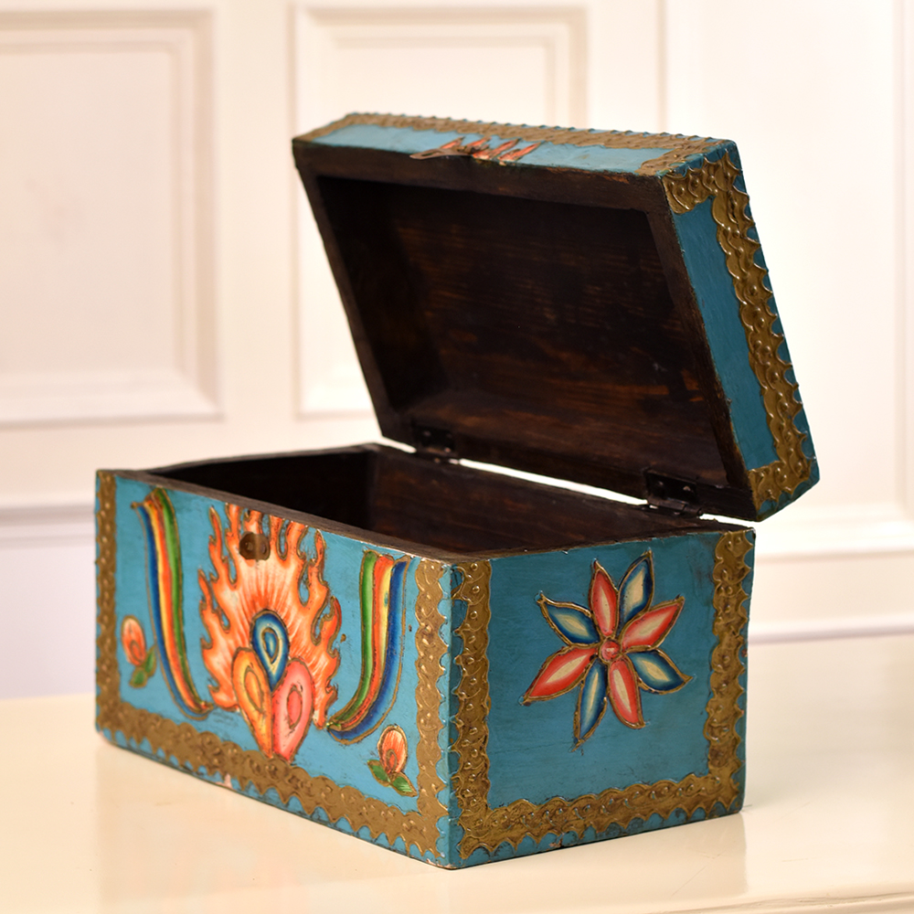 A rectangular wooden box which is a true masterpiece crafted by professional Indian craftsmen with unwavering dedication to their craft. This enchanting box is a work of art, designed to captivate your senses with its stunning beauty and meticulous attention to detail. Handcrafted from high-quality wood, this box boasts a rich and natural texture that exudes elegance and sophistication. The box's multi-colour finish, achieved through careful hand-painting, adds a delightful vibrancy, making it an eye-catching addition to any room. Its intricate engravings tell a story of tradition and culture, showcasing the artisan's mastery of their craft. Practicality meets aesthetics with a secure latch, ensuring your precious jewelry or small trinkets remain safely stored. Versatile in its functionality, it is not only a jewelry box but also an ideal storage solution for various small items. Its undeniable charm makes it an excellent choice for exhibitions or a remarkable gift to celebrate special or festive occasions.