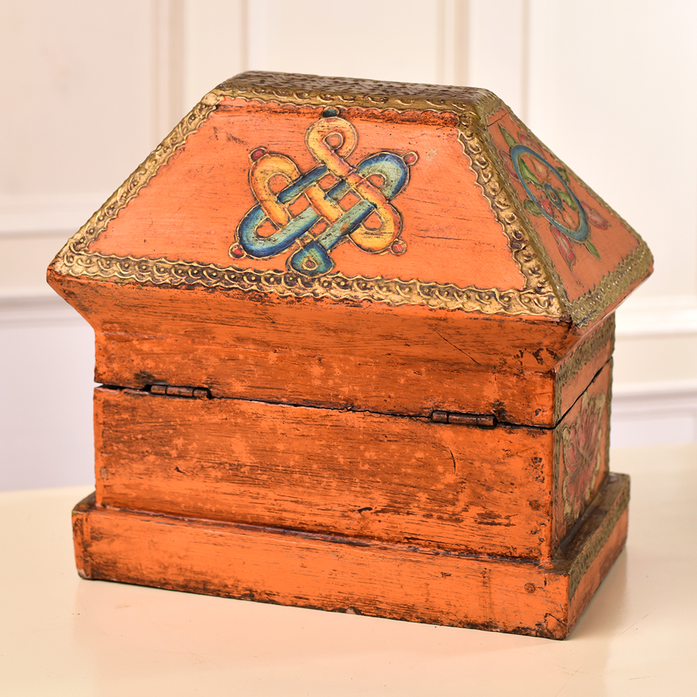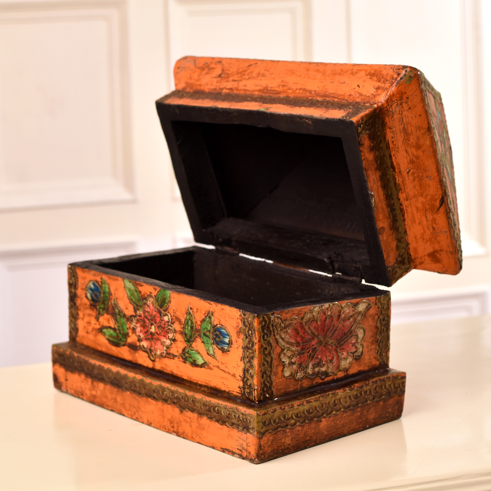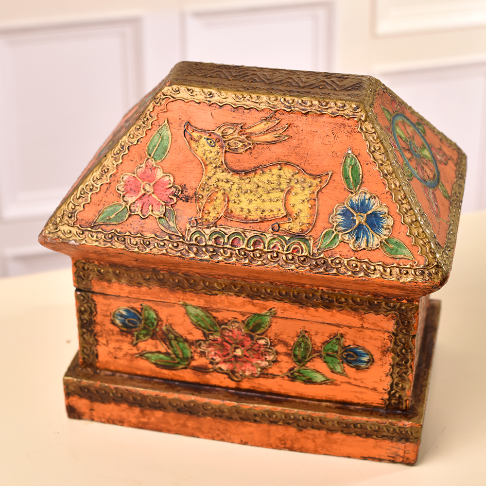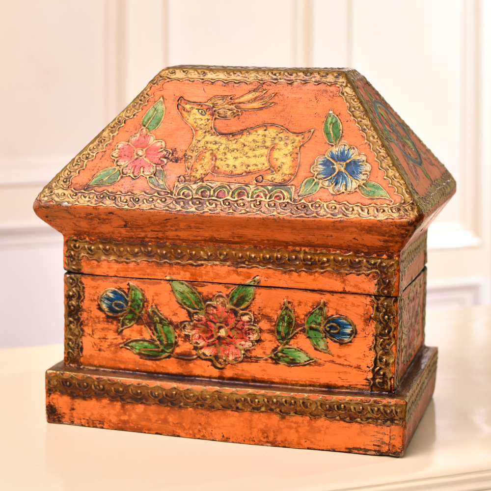 Discover the epitome of craftsmanship with our wooden box that is a testament to the skill of Indian artisans. Handmade with precision and passion, this multi-coloured marvel features intricate engravings of animals and florals that tell a story of nature's beauty. Crafted from high-quality wood, each box is a unique masterpiece, showcasing the artistry passed down through generations. Equipped with a secure latch, it doubles as a jewelry box, keeping your precious treasures safe. Beyond its practicality, this box is a work of art fit for display at exhibitions, a conversation starter that captivates with its vibrant hues and detailed carvings. What better way to celebrate special occasions than by gifting your family, friends or relatives this symbol of tradition and artistry? Whether it's a birthday, anniversary, or festive celebration, this wooden box is a timeless token of affection that transcends mere utility.