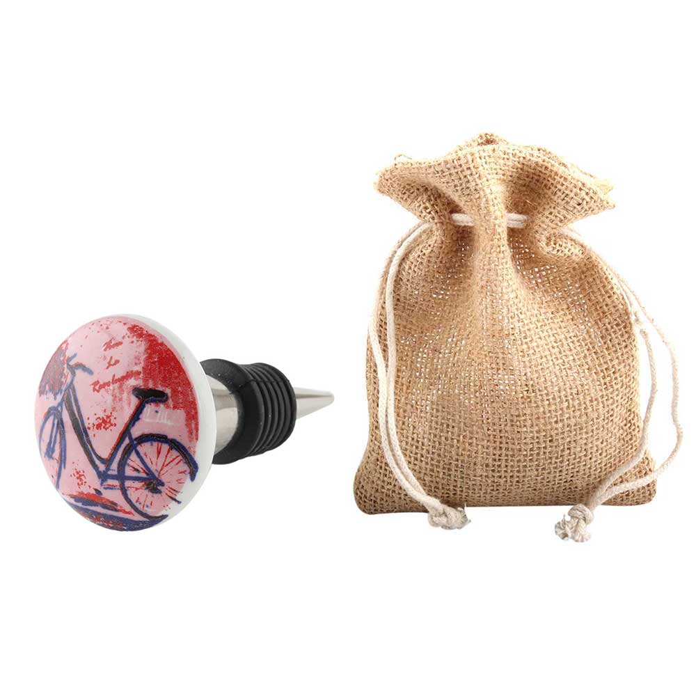 Multicolor Bicycle Flat Ceramic Wine Bottle Stopper. Zinc Alloy Wine Bottle Stopper with Attractive Jute Bag Packaging.