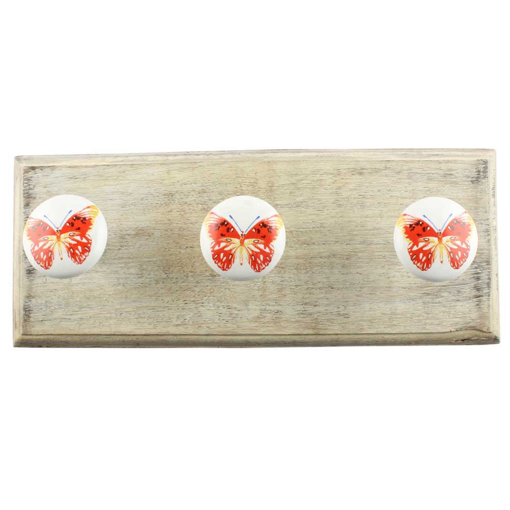 Multicolor Butterfly Ceramic Flat Wooden Hook. A Perfect Complement to the Soft Tone of the Wood are these White Traditional Hat and Coat Hook Made of Genuine Porcelain and Brass. It can be used to Hang Jewelry, Leashes, Towels, Scarves, Light Weight Sweaters, Caps etc.