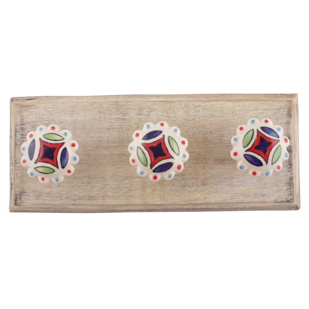 Multicolor Ceramic Floral Wooden Hooks. A Perfect Complement to the Soft Tone of the Wood are these White Traditional Hat and Coat Hook Made of Genuine Porcelain and Brass. It can be used to Hang Jewelry, Leashes, Towels, Scarves, Light Weight Sweaters, Caps etc.