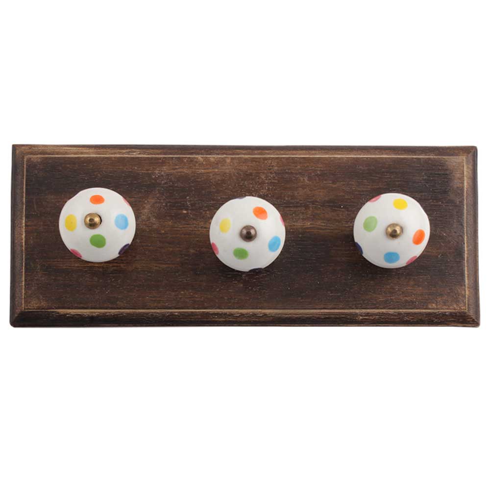 Multicolor Dot Wooden Hooks . A Perfect Complement to the Soft Tone of the Wood are these White Traditional Hat Coat Hook Made of Genuine Porcelain and Brass. It can be use to Hang Jewellery, Leashes, Towels, Scarves, Light Weight Sweaters, Caps Etc.