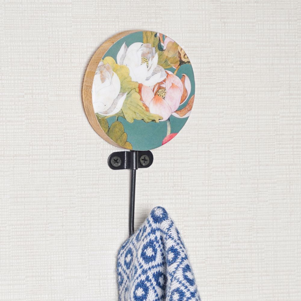 Introducing our exquisite wall hook, a stunning blend of modern design and traditional craftsmanship. Handmade by skilled Indian craftsmen, this unique piece features a perfect combination of resin and wood, beautifully engraved with lovely colourful flowers on wood, and adorned with a sleek black finish resin hook. This wall hook is not just functional, but also adds a touch of elegance to any space. With its eye-catching design, this wall hook serves as both a practical solution for organizing your coats, hats, or towels, and a decorative accent for your home or bathroom. The high-quality materials used in its construction ensure durability and longevity, making it a reliable addition to your space. Whether you hang it in your entryway, bedroom, bathroom, or hallway, it is sure to become a conversation starter. This wall hook also makes for a thoughtful gift on special or festive occasions, adding a touch of Indian craftsmanship and charm to your loved one's home