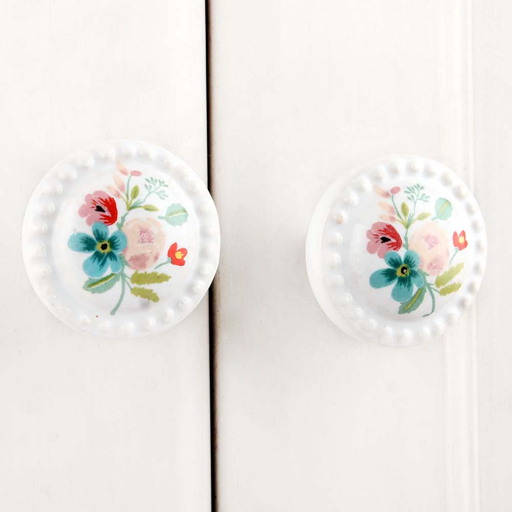 The Multicolor White Flower Ceramic Knob features a delicate floral design in a variety of colors, set against a pristine white background. The intricate pattern and bright colors make this knob a captivating focal point for your furniture, while the smooth ceramic finish enhances the overall elegance and charm.
