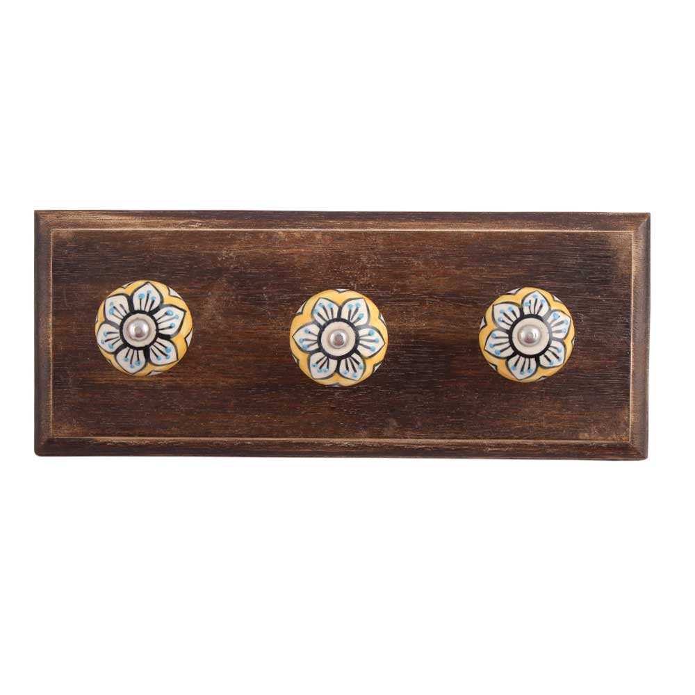 Mustard Flower Ceramic Wooden Hook. A Perfect Complement to the Soft Tone of the Wood are these White Traditional Hat Coat Hook Made of Genuine Porcelain and Brass. It can be use to Hang Jewellery, Leashes, Towels, Scarves, Light Weight Sweaters, Caps Etc.