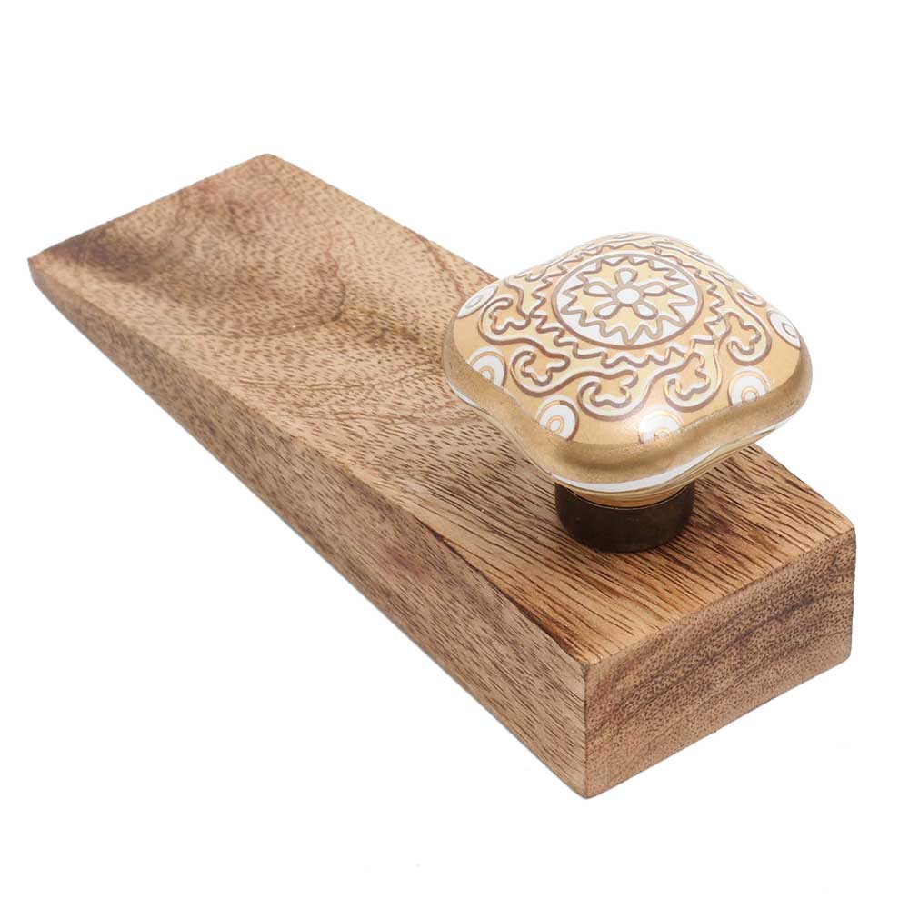 Handmade Ceramic Wooden Door Stopper.Wooden Door Stopper with a Ceramic Knob to Carry it Easily. This Wooden Door Stopper has Glue Dots under it to Ensure that it does not Slip. It is Handmade by the Craftsmen of India and this Innovative Door Stopper won't Disappoint You.