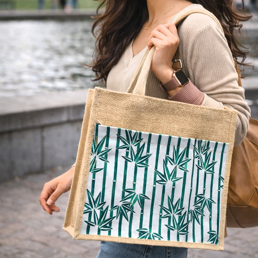 Experience eco-friendly style with this natural jute and cotton laminated bag finished with single colour green printing. Its spacious design suits daily errands and gifts while the laminated lining ensures durability and strength. Handcrafted from sustainable materials it reflects conscious living and is perfect for boutiques events and personal use. Packed and quality checked by Indianshelf.Natural Jute & Cotton HighlightsThis piece features eco-friendly jute fabric with unique design elements appealing to conscious consumers and gift givers.Natural jute bag with cotton lamination and single colour green printing for durability.Entirely handmade and never machine madeSturdy natural jute ensures durability and reusable convenience.Natural Jute Bag Specs Origin: India. Safely packed and quality checked by Indianshelf Lightweight with single side printing and comfortable handle.Eco-Friendly Bag UsesDaily carry bag for errands and shopping.Gift bag for green-themed events and celebrations.Retail packaging to highlight eco-friendly values.Event planners for Earth Day or environmental events.Natural Jute Bag Care GuideCare for the natural jute and cotton lamination bag by keeping it dry and cleaning with a soft cloth. Avoid heavy moisture and prolonged sun. Store flat to retain its shape and durability.Jute Bag FAQsWhat is the fabric type?Natural jute with cotton lamination for strength.What are the bag dimensions?It measures 12 14 5 inches.Is the print on both sides?It has single colour printing on one side only.Is the bag eco-friendly?Yes it uses natural jute and cotton making it sustainable and reusable.Artisan AppreciationEvery piece reflects heritage artistry and careful attention to detail. All our products are handmade never machine made ensuring individuality.