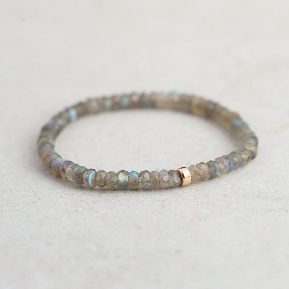 Wear this labradorite bracelet solo for a minimalist look or stack it with slim gold bangles, and store it in a soft pouch to protect the bead surface.