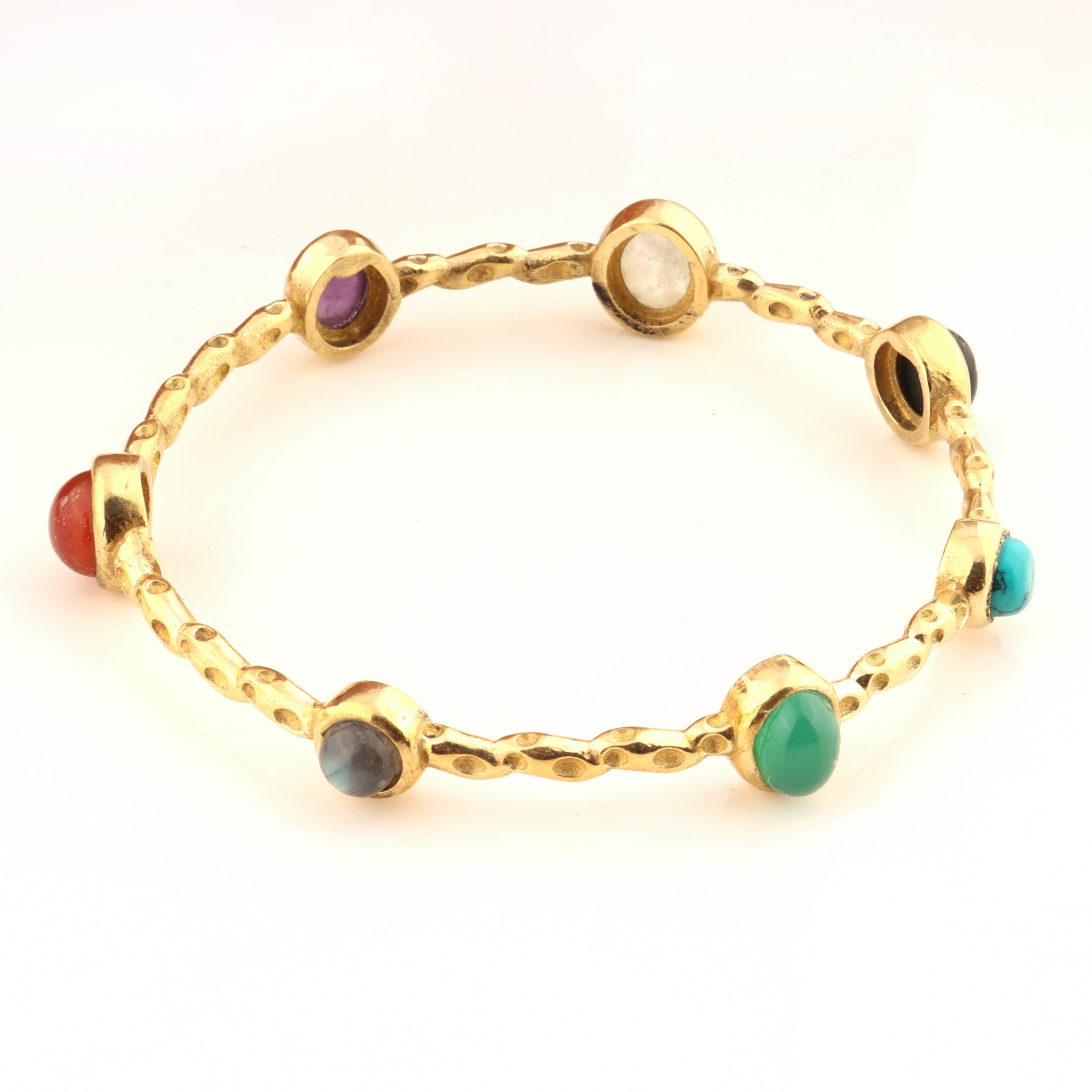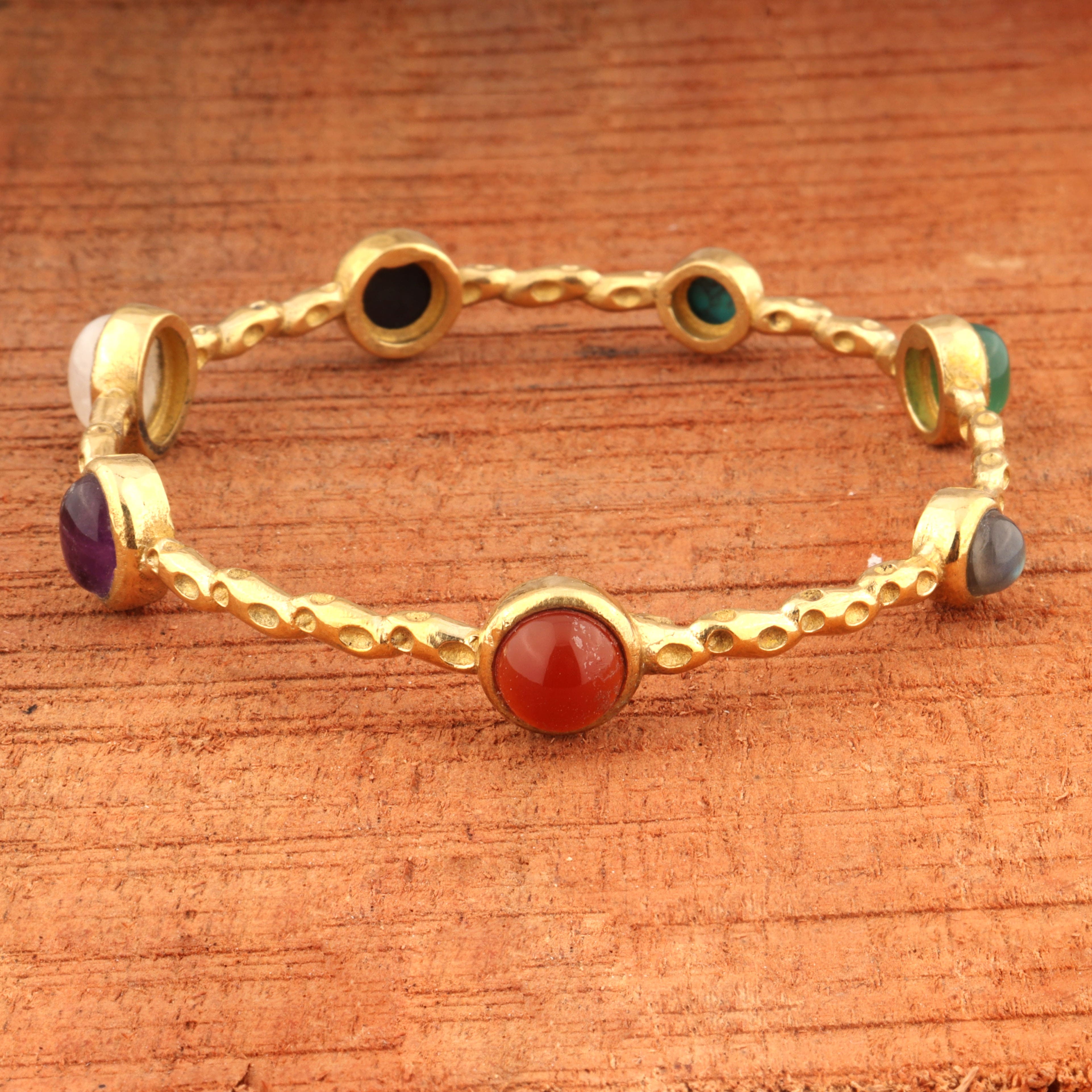 This Natural Multi Gemstone Bangle brings together an array of richly colored gemstones set against the warm glow of 22k gold plated brass. Each stone is carefully placed by artisans, creating a vibrant, elegant piece that stands out with its handcrafted detailing. Designed for women who love expressive, meaningful jewelry, this bangle blends color, craftsmanship, and luxury in a timeless silhouette.