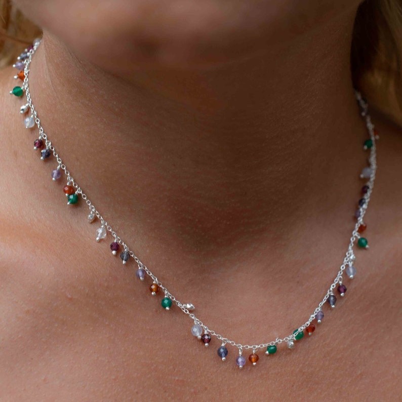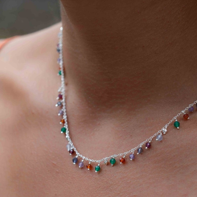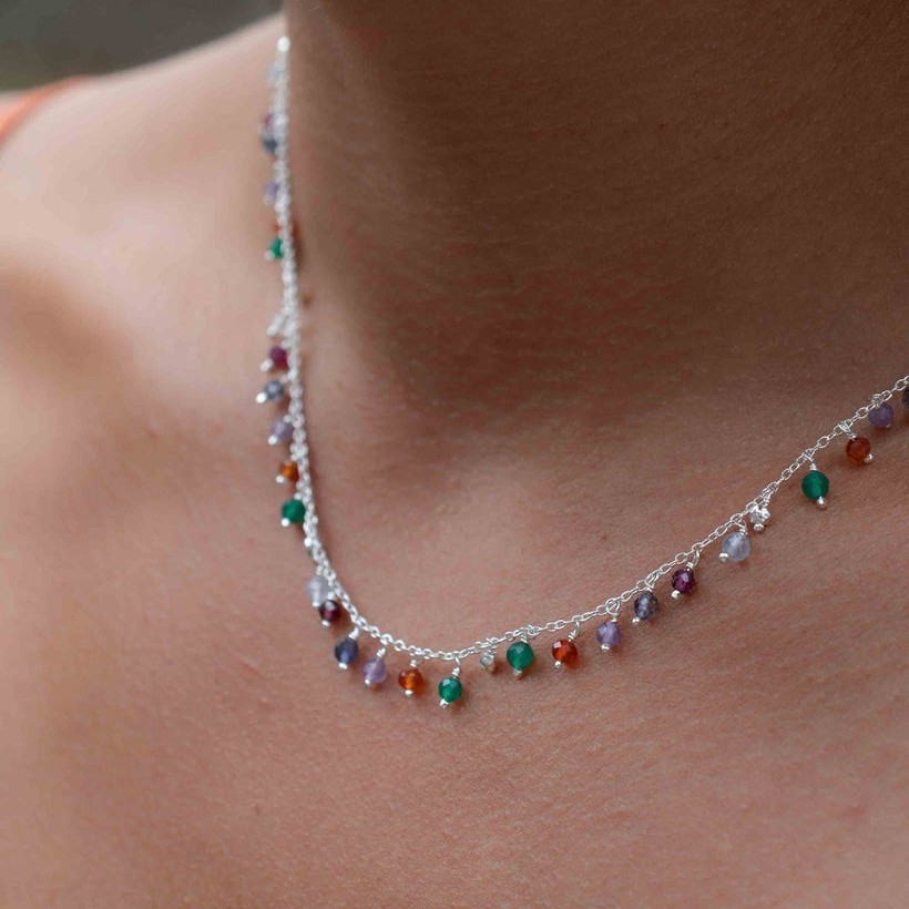 Keep the necklace dry and wipe gently after each wear to preserve the silver-tone shine and natural gemstone clarity.