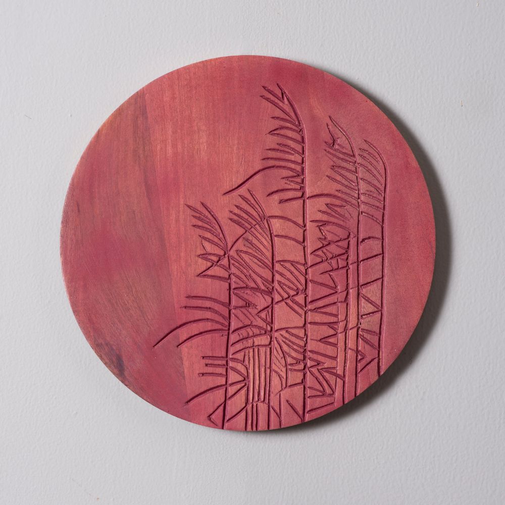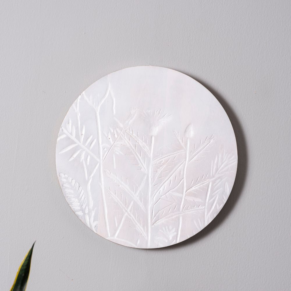 Enhance your interiors with this set of four handcrafted round wooden wall plates. Each plate features delicate botanical carvings, highlighted in tones of white, red, and muted pink, making it a versatile choice for contemporary and traditional spaces alike. Packed & quality-checked by Indianshelf.
