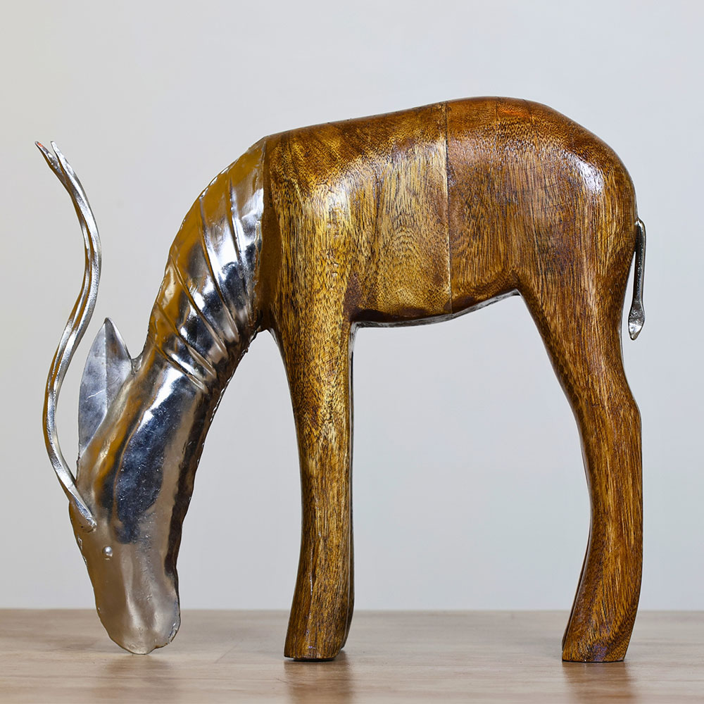 Channel rustic serenity with this natural wood deer sculpture, handcrafted from solid wood and adorned with polished metal details. Its wildlife-inspired design captures the essence of safari dcor, offering a calming presence for decorators, nature enthusiasts, and gift seekers who value organic textures and timeless silhouettes. Packed & quality-checked by Indianshelf.