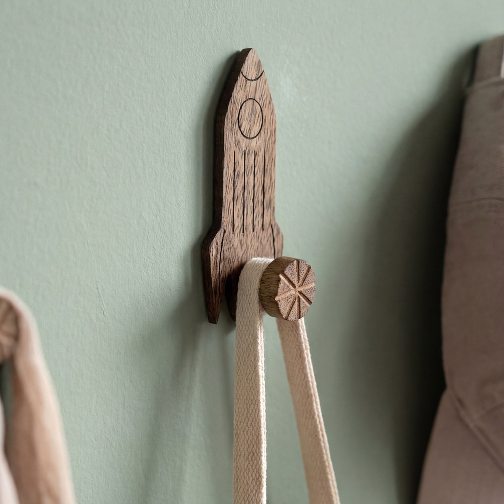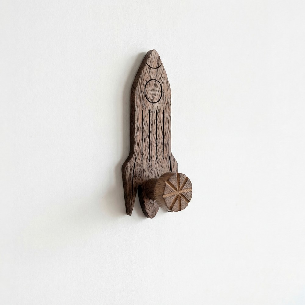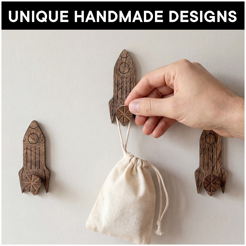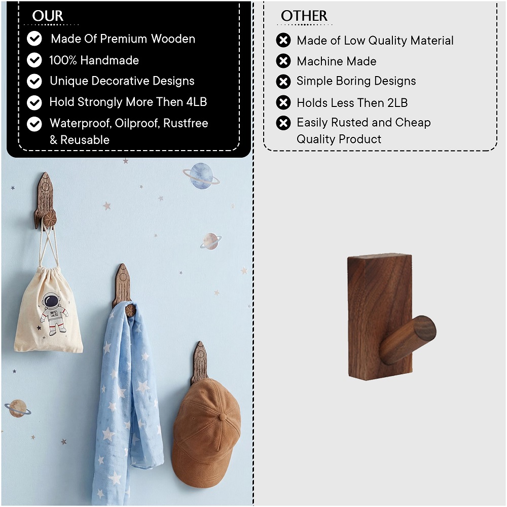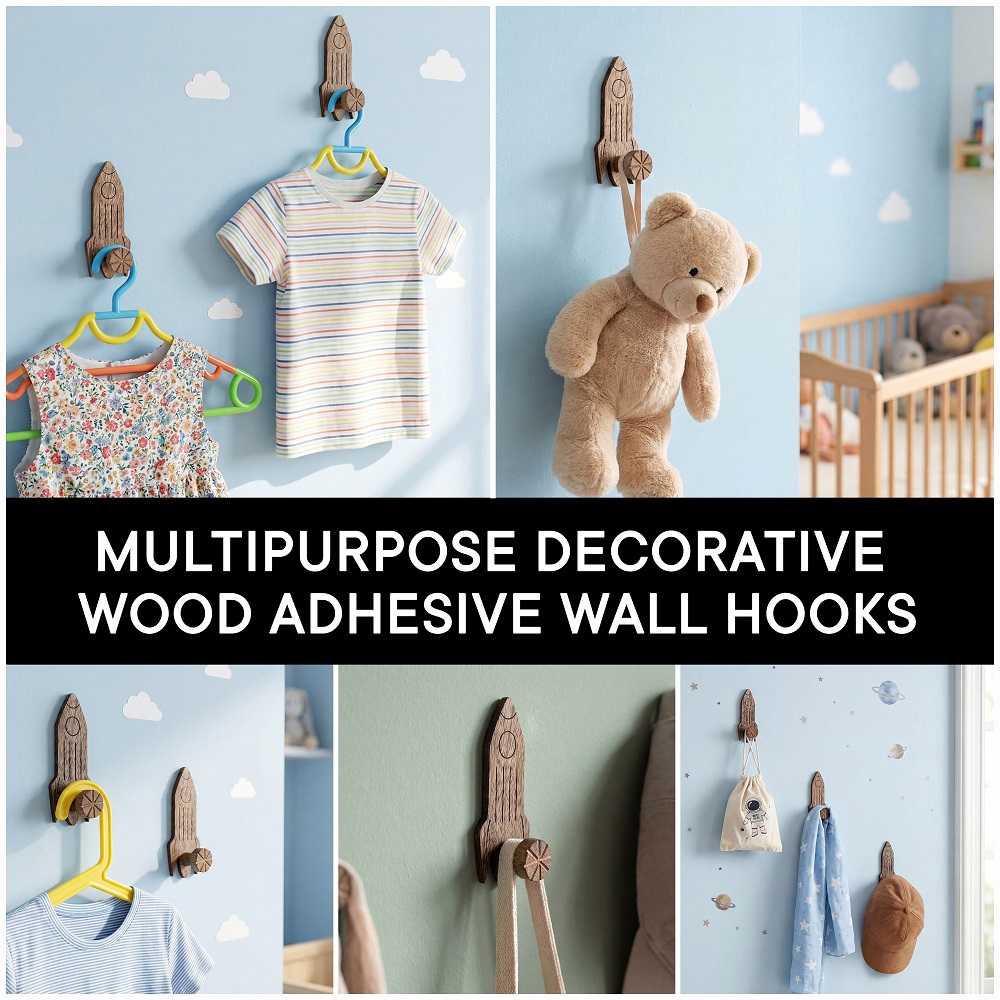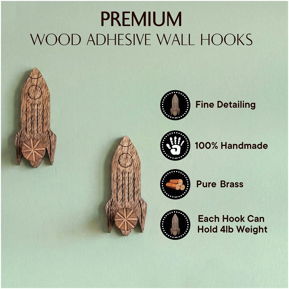 Natural Wooden Adhesive Rocket Shape Coat Wall Hook. This Hook is Strong Enough to Hold Your Cloths, Keys, Tea Cups, Coffee Mugs, Hand Towels Etc.