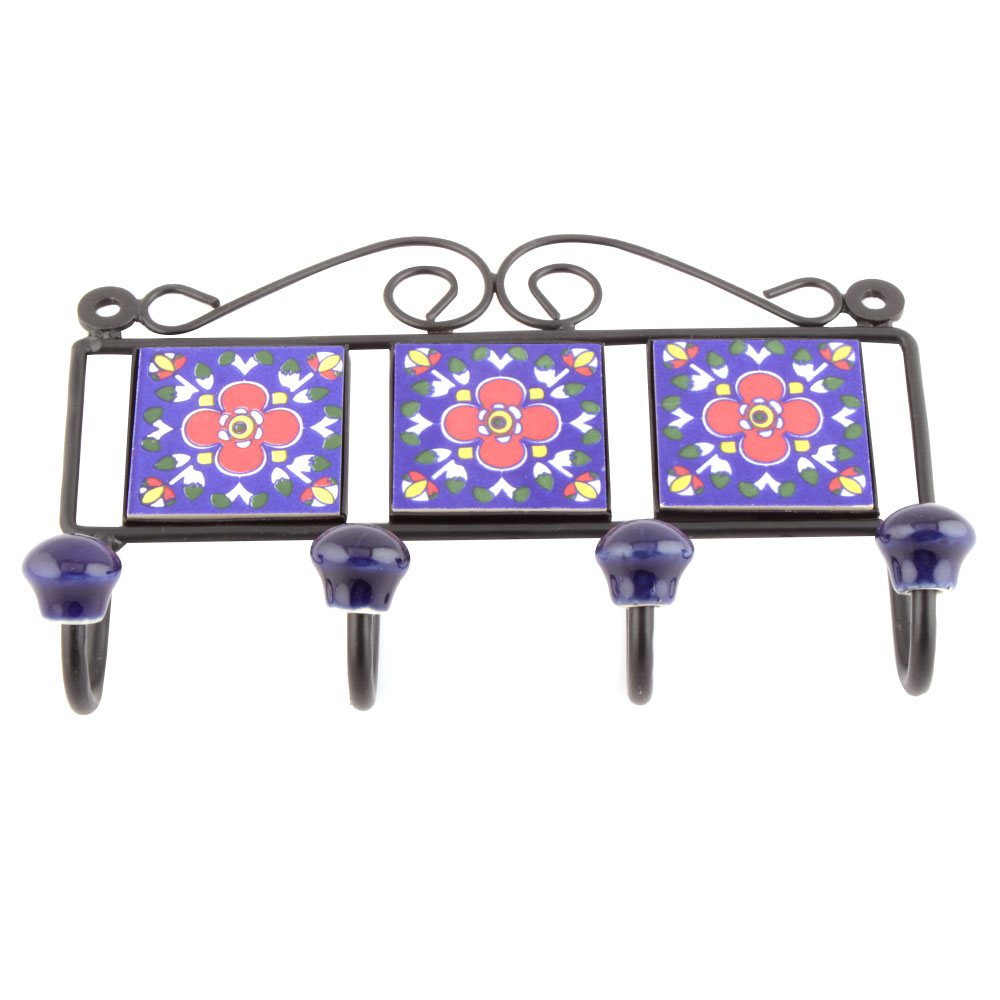 Navy Blue And Red Floral Tiles Hooks. When Put on Wall or Cabinet it is an Art in itself. The Metal Part of this Hook is Black Powder Coated.