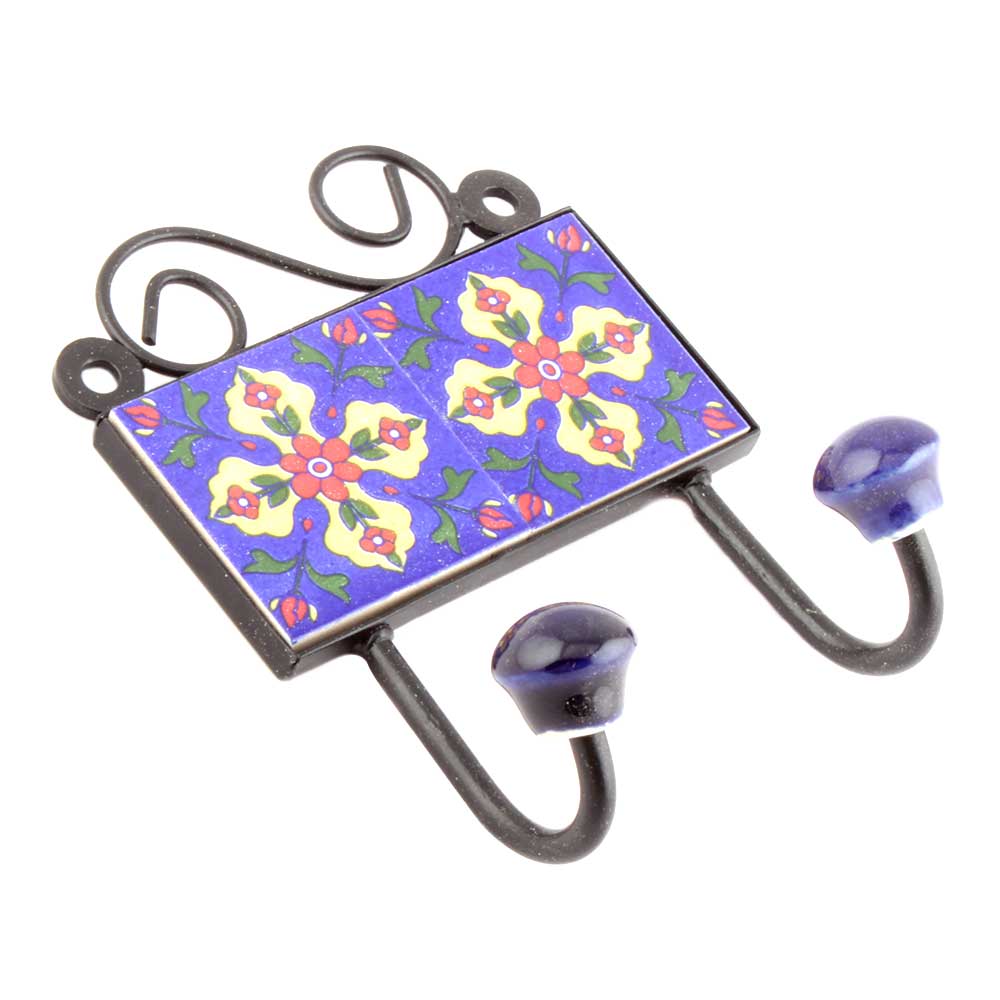 Navy Blue And Red Tiny Flower Tiles Hooks. When Put on Wall or Cabinet it is an Art in itself. The Metal Part of this Hook is Black Powder Coated.
