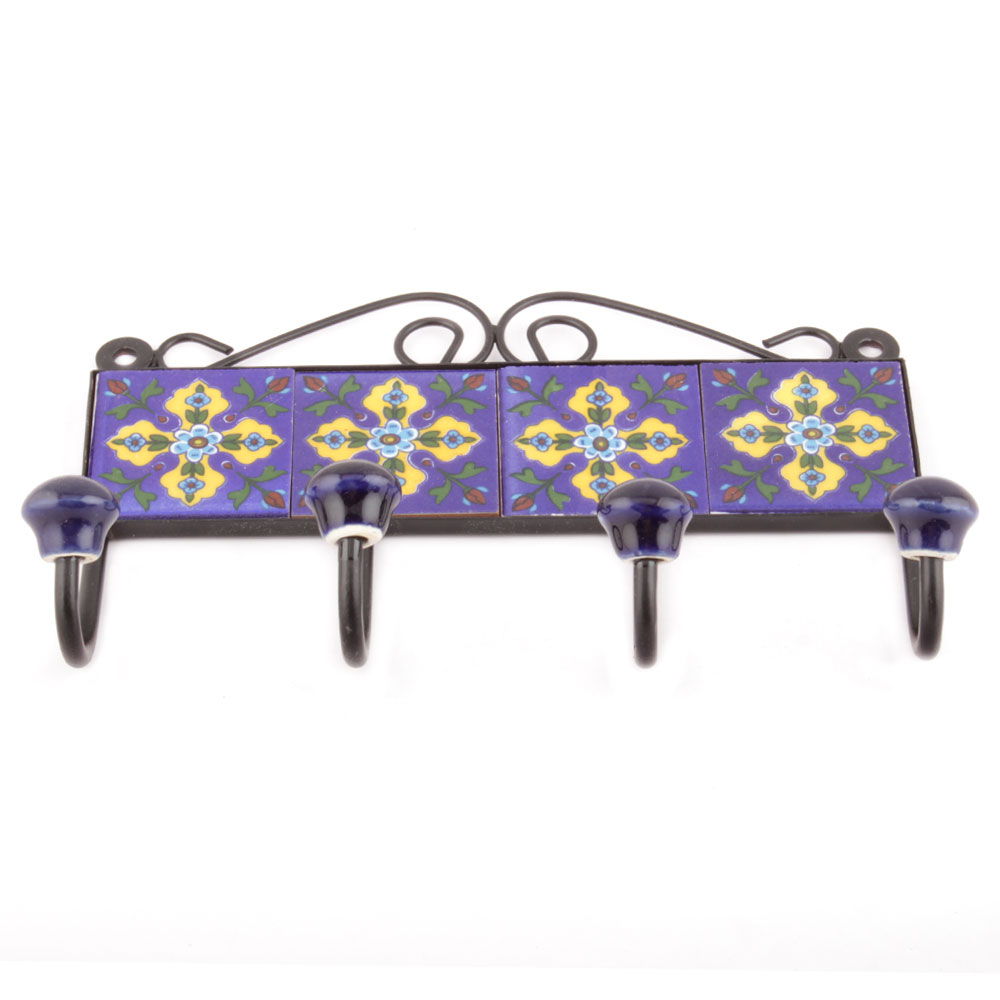 Navy Blue And Turquoise Tiny Flower Ceramic Tiles Hooks Online. When Put on Wall or Cabinet it is an Art in itself. The Metal Part of this Hook is Black Powder Coated.