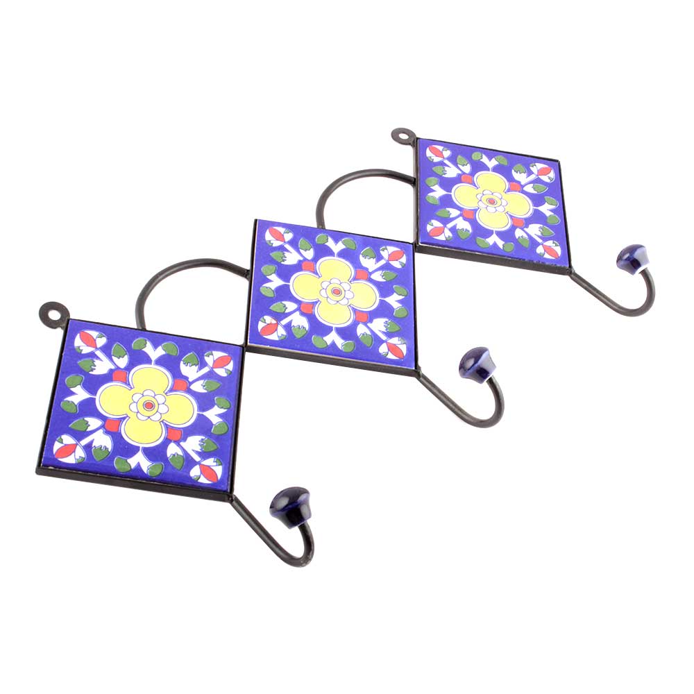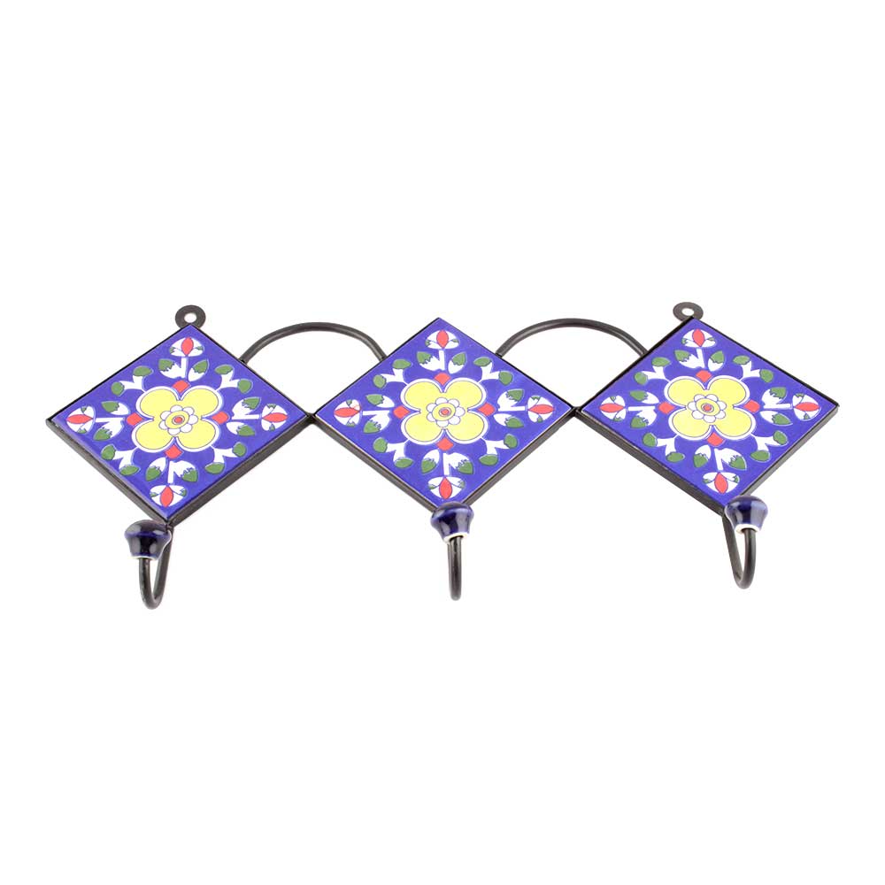 Navy Blue And Yellow Ceramic Floral Tiles Hooks. When Put on Wall or Cabinet it is an Art in itself. The Metal Part of this Hook is Black Powder Coated.
