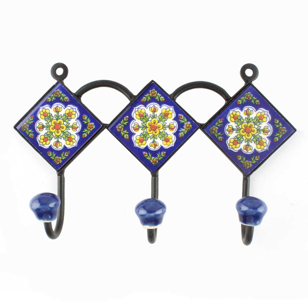 Navy Blue And Yellow Tiny Flower Ceramic Tiles Hook. When Put on Wall or Cabinet It is An Art in Itself. The Metal Part of this Hook is Black Powder Coated.