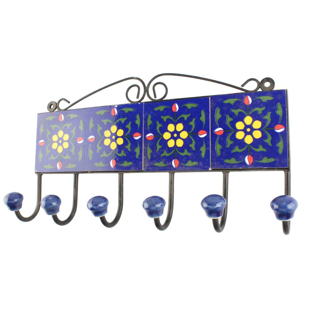 Navy Blue And Yellow Tiny Flower Ceramic Tiles Hook. When Put on Wall or Cabinet It is An Art in Itself. The Metal Part of this Hook is Black Powder Coated.