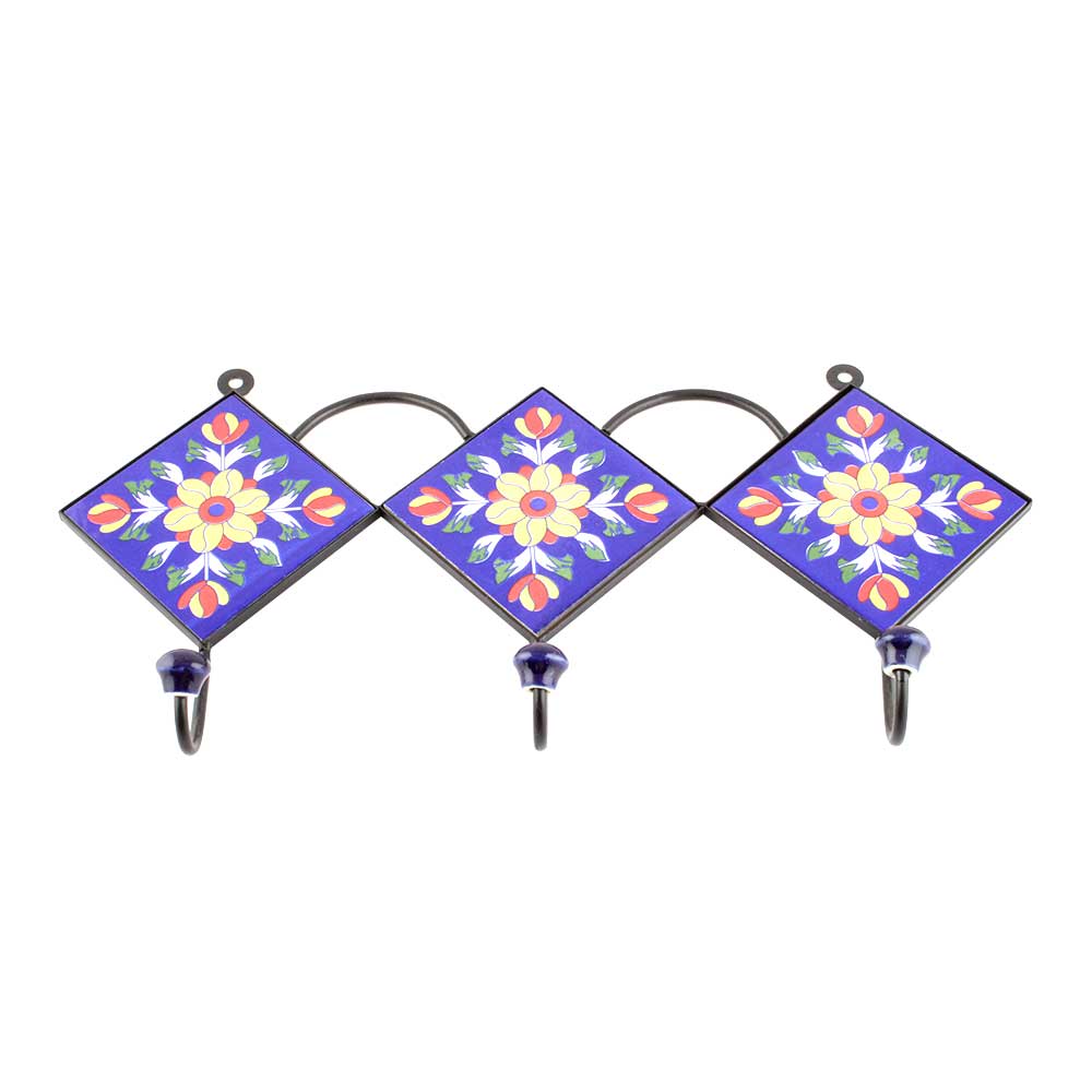 Navy Blue And Yellow Tiny Flower Ceramic Tiles Hooks Online. When Put on Wall or Cabinet it is an Art in itself. The Metal Part of this Hook is Black Powder Coated.