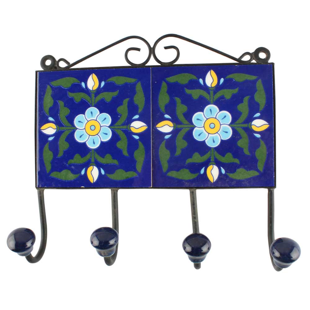 Navy Blue Ceramic Floral Tile Wall Hook Online. When Put on Wall or Cabinet It is An Art in Itself. The Metal Part of this Hook is Black Powder Coated.