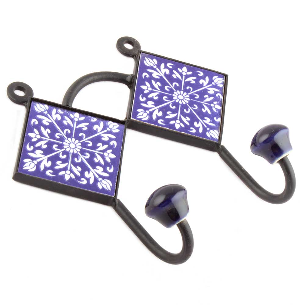 Navy Blue Ceramic Floral Tiles Hooks. When Put on Wall or Cabinet It is An Art in Itself. The Metal Part of this Hook is Black Powder Coated.