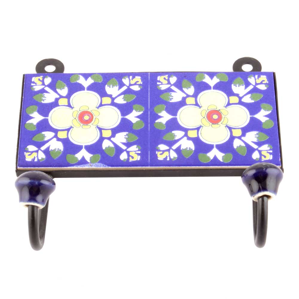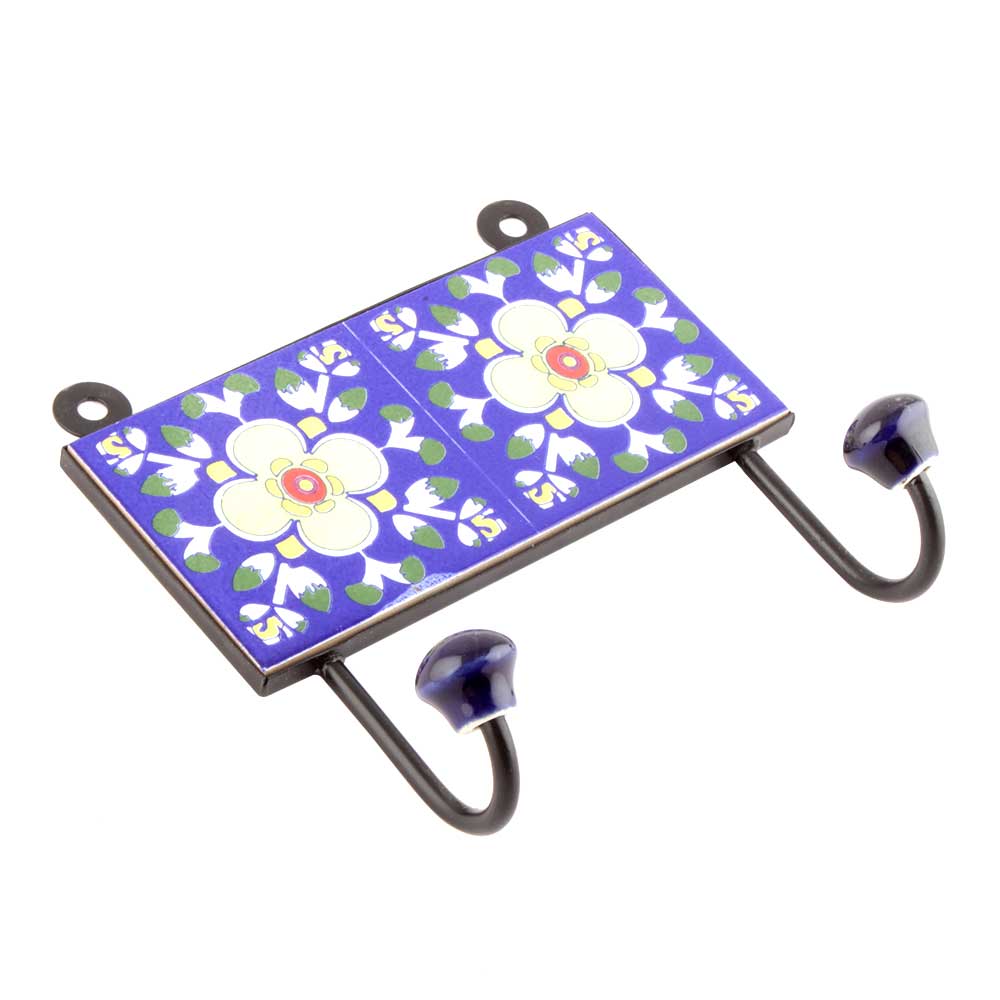 Navy Blue Ceramic Floral Tiles Hooks Online. When Put on Wall or Cabinet it is an Art in itself. The Metal Part of this Hook is Black Powder Coated.