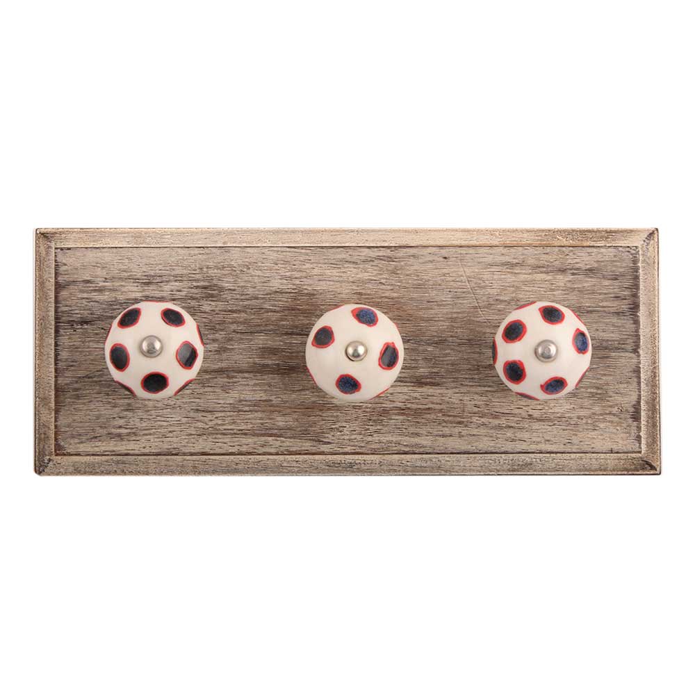 Navy Blue Dot Ceramic Wooden Hook. A Perfect Complement to the Soft Tone of the Wood are these White Traditional Hat & Coat Hook Made of Genuine Porcelain and Brass. It can be use to Hang Jewellery, Leashes, Towels, Scarves, Light Weight Sweaters, Caps Etc.