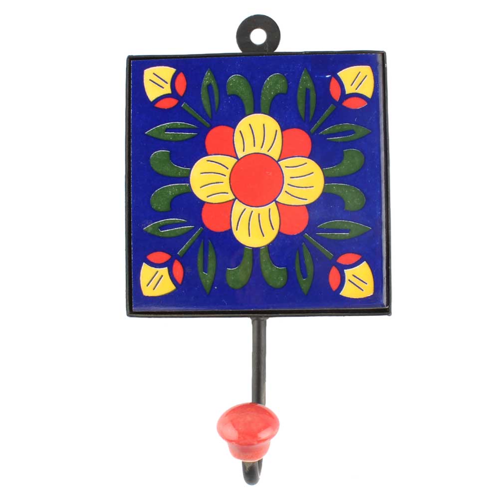 Navy Blue Floral Ceramic Tile Hook. When Put on Wall or Cabinet It is An Art in Itself. The Metal Part of this Hook is Black Powder Coated.