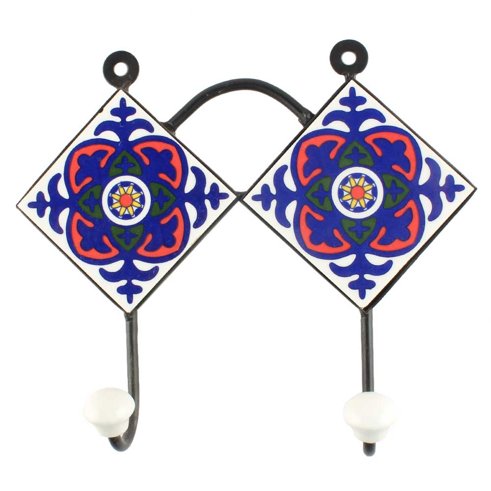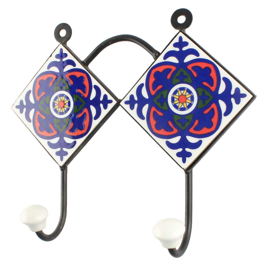 Navy Blue Floral Ceramic Tile Hook. When Put on Wall or Cabinet It is An Art in Itself. The Metal Part of this Hook is Black Powder Coated.