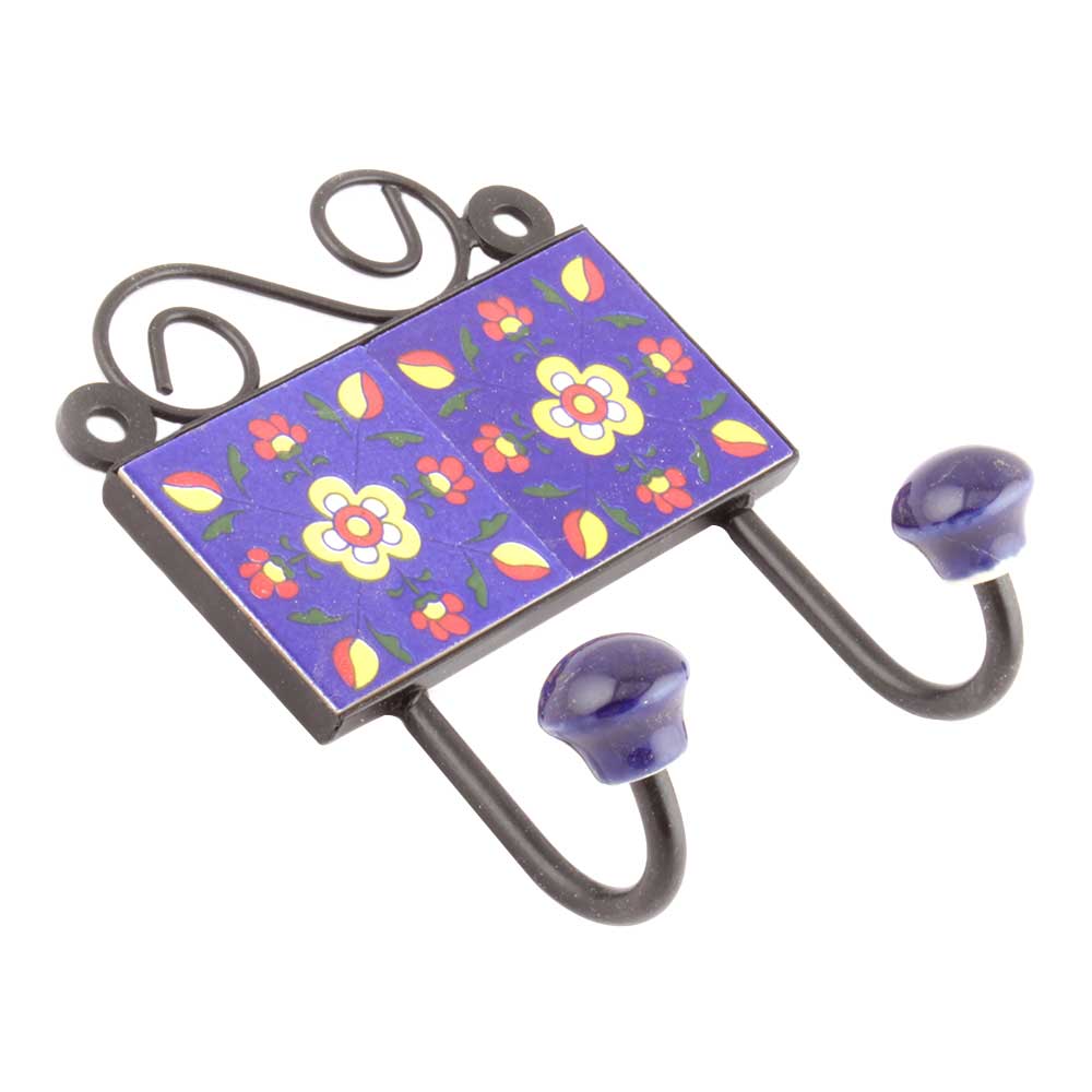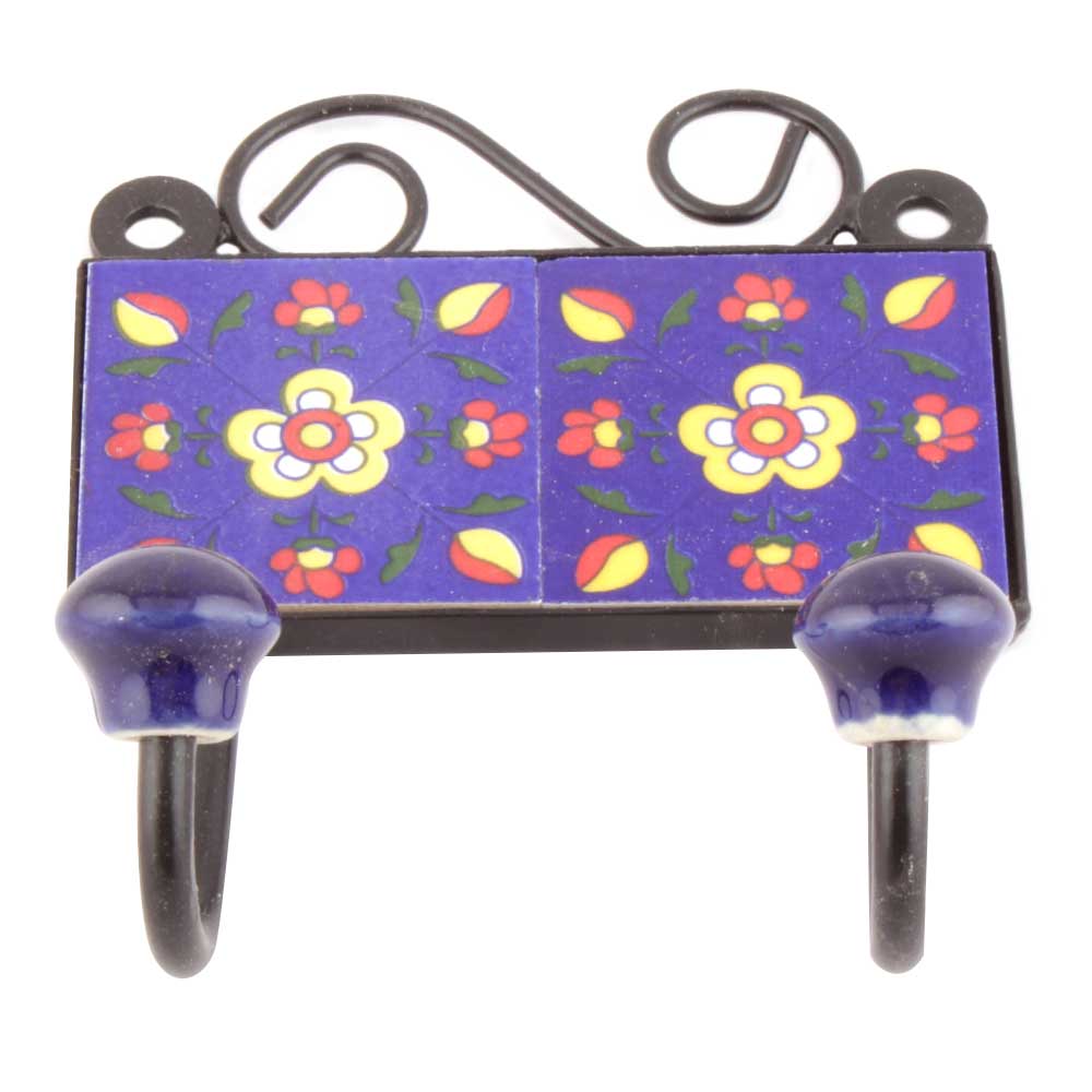 Navy Blue Floral Tiles Hooks. When Put on Wall or Cabinet it is an Art in itself. The Metal Part of this Hook is Black Powder Coated.