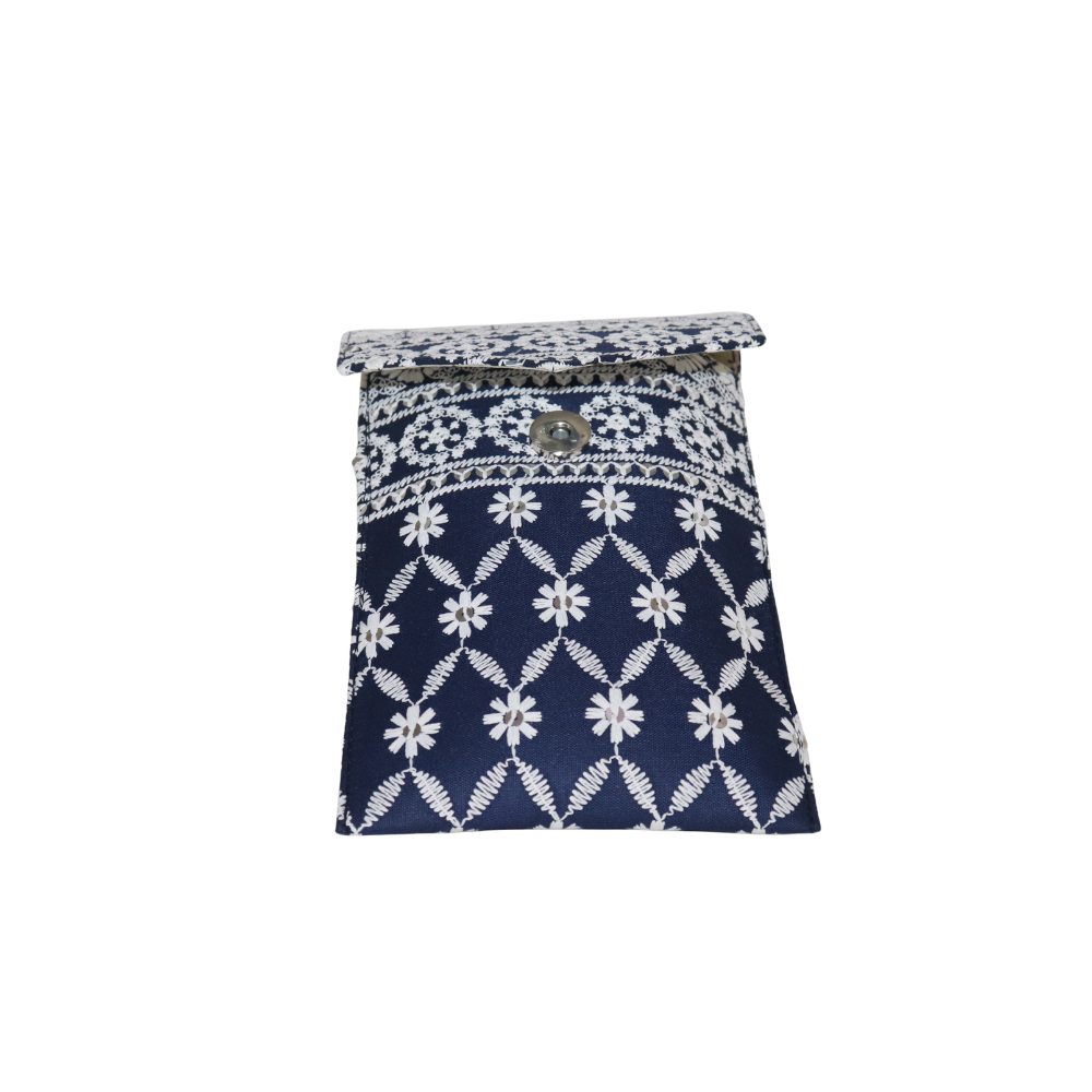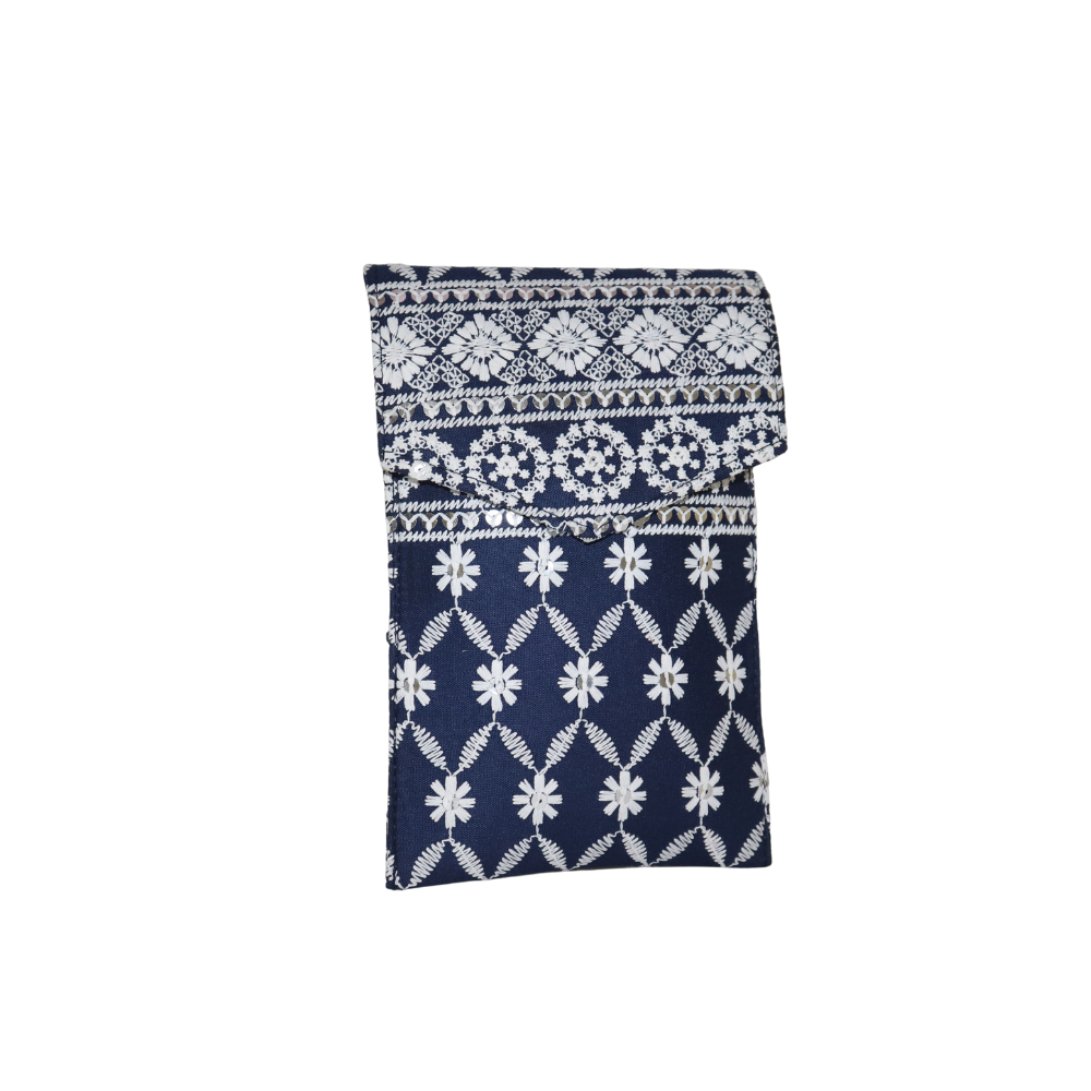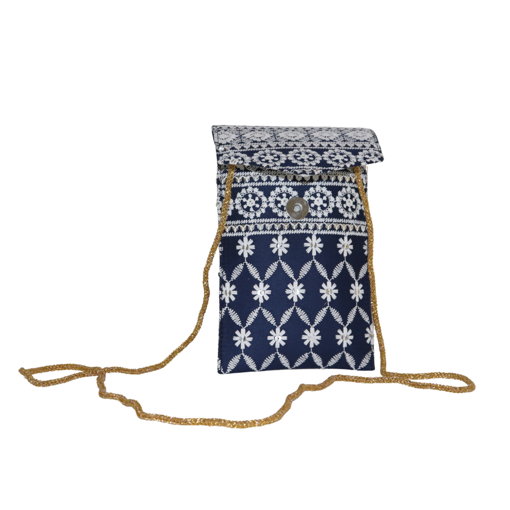 Brighten up your accessories collection with this stunning handmade cotton clutch, featuring delicate mirror work and floral embroidery. The deep navy blue fabric serves as the perfect backdrop for the intricate white floral designs, creating a timeless, elegant look. Perfect for casual outings, weddings, or evening events, this clutch combines artistry with functionality. The soft cotton material is complemented by a stylish gold chain strap, making it easy to carry your essentials hands-free. With a secure button closure, your items stay safe while you make a statement. This handcrafted clutch is designed with precision and attention to detail, adding a pop of style to any outfit. Whether you’re dressing up for a special occasion or looking to add a touch of elegance to a more casual ensemble, this clutch is the perfect accessory.