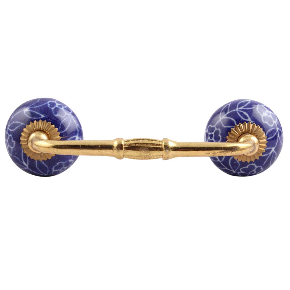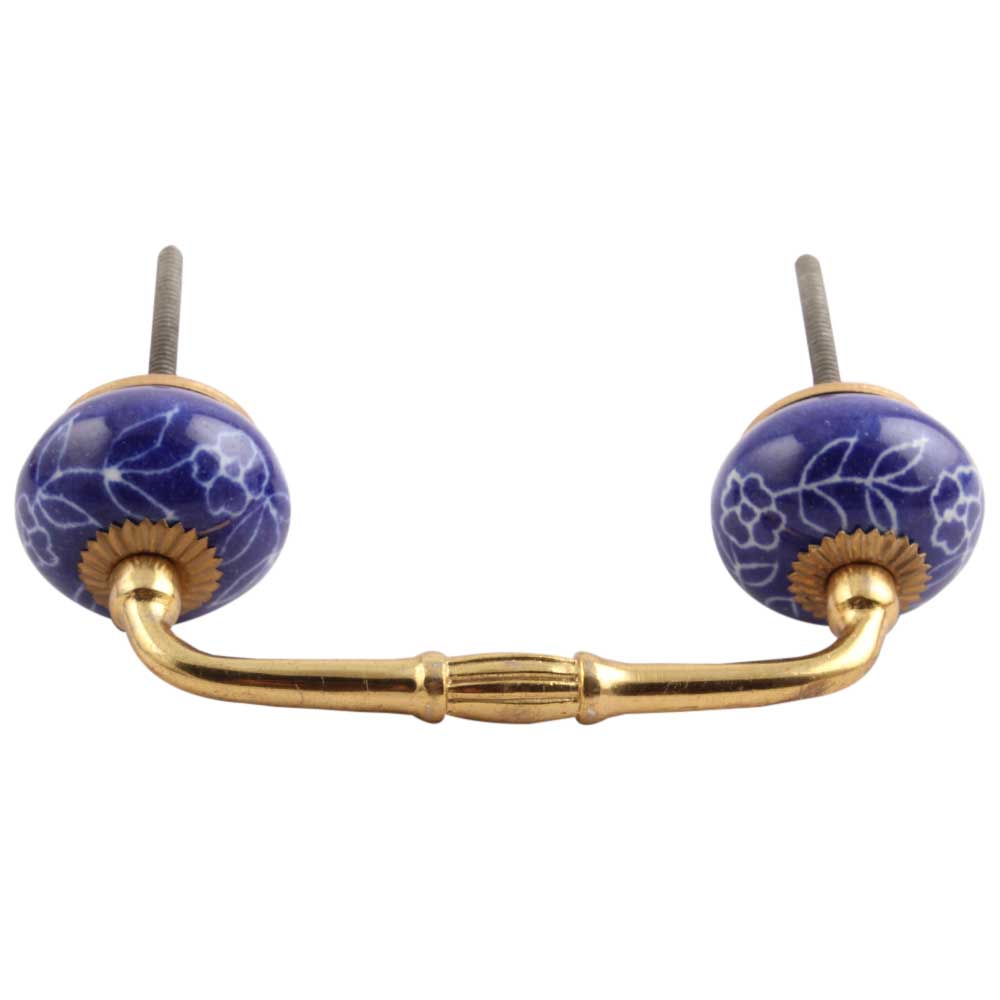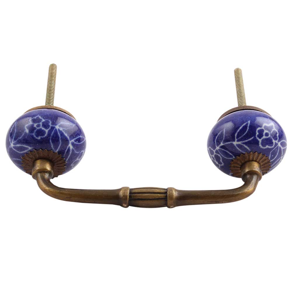 Navy Blue Leaf Floral Ceramic Bridge Handle. Ideal for Drawer, Dresser, Cabinet, Wardrobe, Cupboard and Almirah.